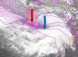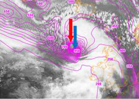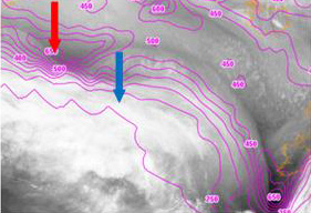 The next three images show the development of a Rapid Cyclogenesis. A PV anomaly (red arrow) protrudes downward and approaches the location of the surface low center (blue arrow) and simultaneously the cloud head turns into a cloud spiral.