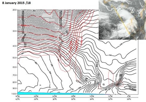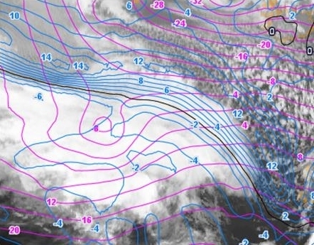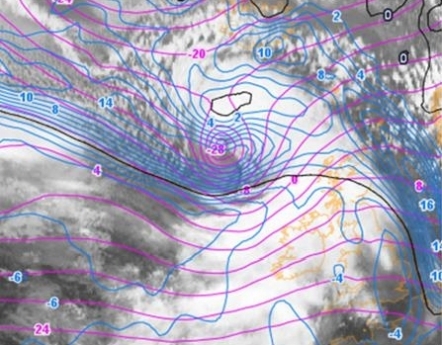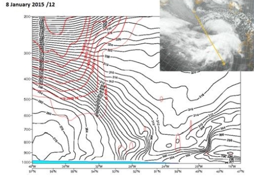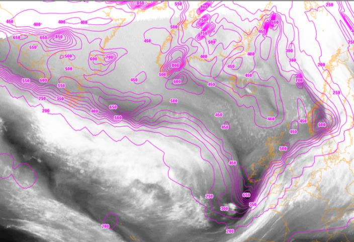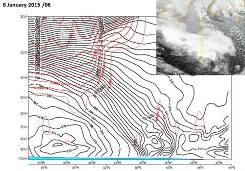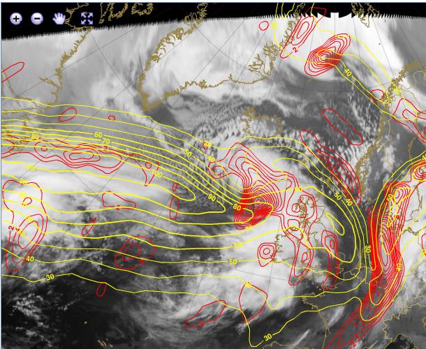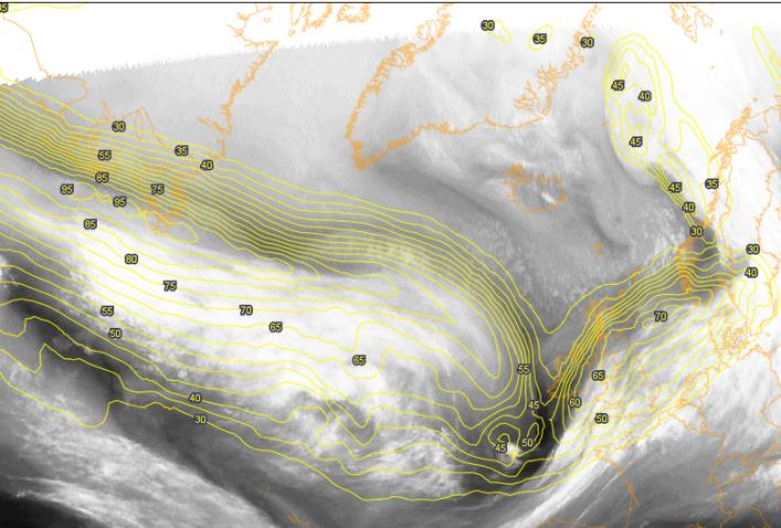 The jet stream axis lies parallel to the frontal cloud band with dry stratospheric air approaching the cloud head. This is the black stripe typically seen in WV imagery. Also, the PV values there are higher than 1 PVU. The emerging cloud head in the initial and development stage of the Rapid Cyclogenesis usually appears in the left exit region of a jet streak. This can be seen in the following WV 6.3 μm image from 8 January 2015 at 06 UTC with isotachs at 300 hPa, height of PVU > 2 and the PVA maximum at 300 hPa superimposed.