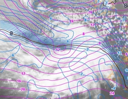 There are some similarities between Rapid Cyclogenesis events and the Shapiro-Keyser model, such as the west-east orientation of the frontal system, the very intensive warm advection in the warm front and cloud head cloudiness (especially in the beginning of the process), the dissolution of cold front cloudiness in a more advanced stage, and, in nearly all cases, a recognizable cloud spiral around the low center in the final stage.
