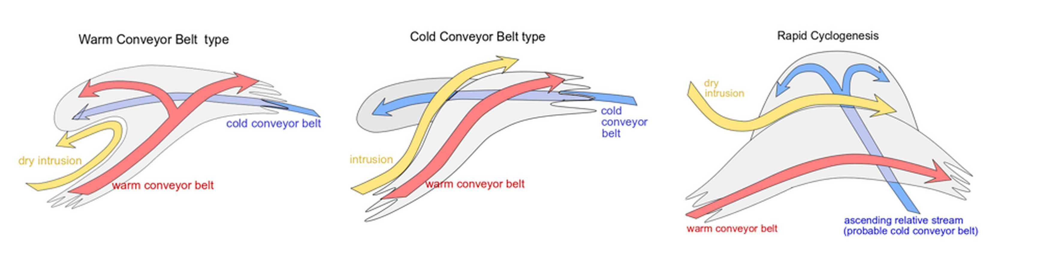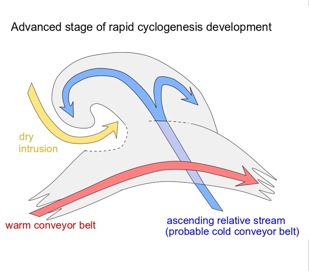 As the schematics of the initial stages show, the warm conveyor belt and dry intrusion are also involved in the rapid cyclogenesis types. But there are also differences to the classical occlusion types: the cloud head of a Rapid Cyclogenesis is formed within the lower and mid-levels of the troposphere by a rapidly ascending relative stream (conveyor belt) from the south, which advects moist air from lower latitudes beneath the warm conveyor belt of the frontal zone. This relative stream of a Rapid Cyclogenesis has several similarities with the cold conveyor belt in the polar front theory of cyclogenesis, which also is an ascending relative stream below the warm conveyor belt, forming the cloudiness of the occlusion spiral. But such a cold conveyor belt usually originates from the east and is usually less warm and humid. So, it is not evident if the cold conveyor belt in connection with an occlusion spiral and the ascending relative stream in connection with the cloud head are same or comparable.