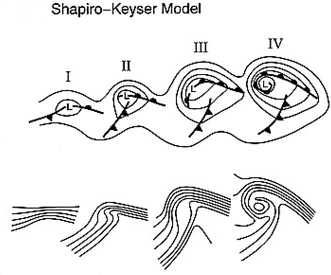 Another theory of cyclogenesis that also deviates from classical polar front theory has been discussed in the literature more and more often in the last decades. It is the Shapiro-Keyser cyclone model and it is mentioned here because some authors suggest that a Rapid Cyclogenesis is the result of this cyclogenetic process.