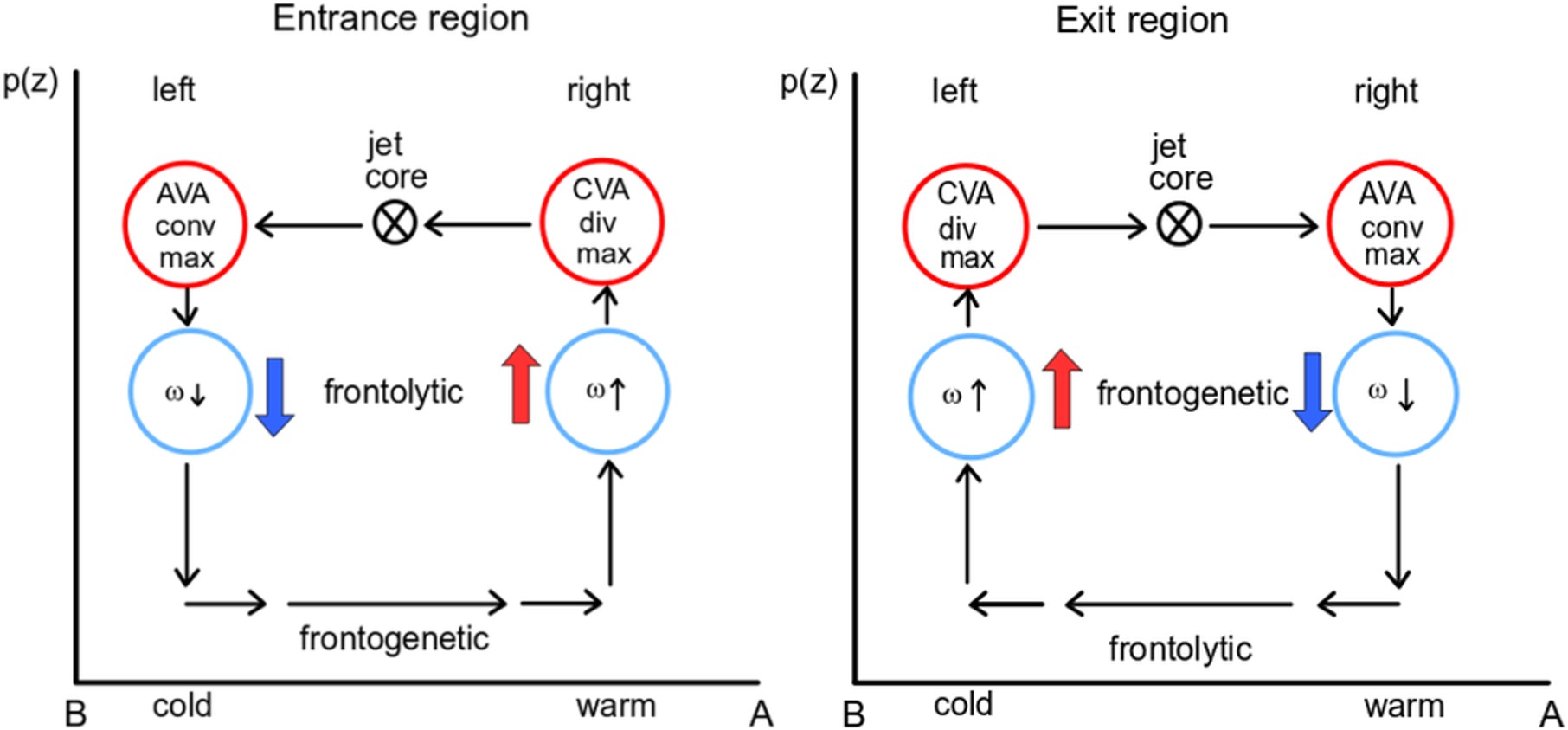 In the entrance region the frontogenetic process occurs mostly in the lower troposphere, which causes the process to last a longer time, typically more than 24 hours.