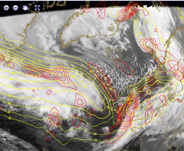 Fig. 15: 8 January 2015, 18 UTC - Meteosat 10; IR 10.8 image; yellow: isotachs 300 hPa; red: positive vorticity advection 300 hPa.