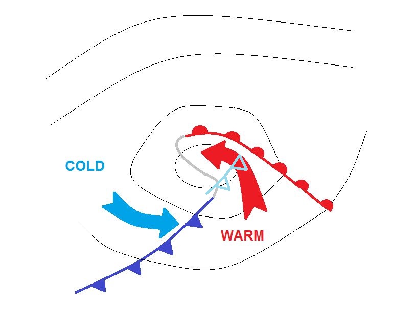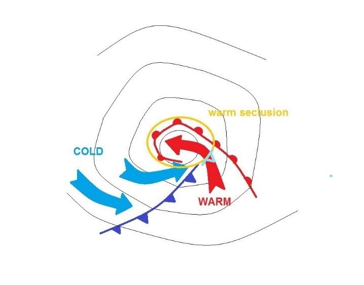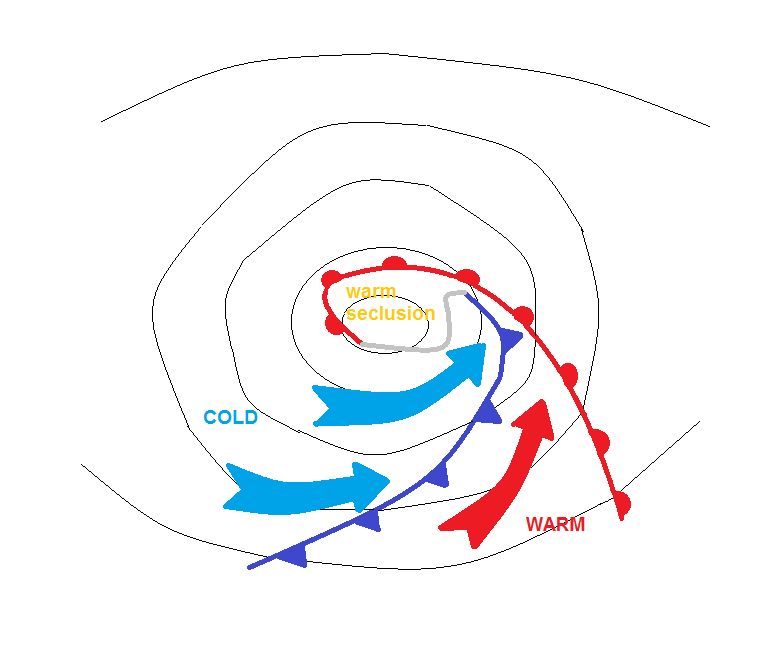 In the Norwegian cyclone model, which is more or less a description of moving air masses, the cold front catches up the warm front during the evolutionary process. The warm air is wrapped around the cold core of the system while simultaneously being lifted.