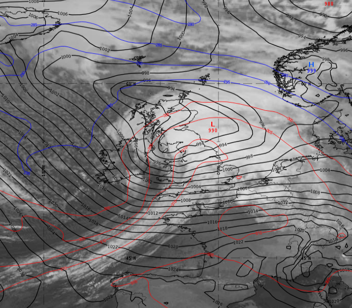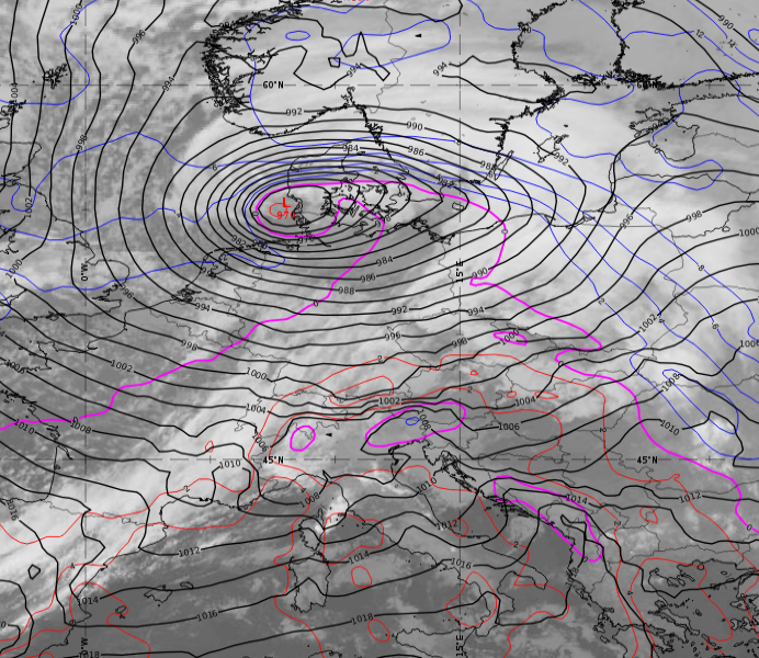 Right: IR 10.8 μm imagery from 2 December 2021 at 12:00 UTC. Mean surface pressure (black) and ThetaE at 700 hPa (blue and red isolines).