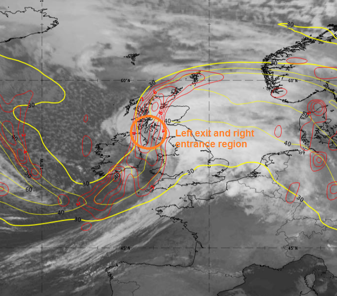 During the early stages of the cyclone development, we usually find two jet streaks: the first is located behind the cold front and the other lies ahead of the warm front. At the beginning of the intensification stage, the jet streaks are nearly parallel to each other. This usually leads to the observation of a jet streak coupling, i.e., the left exit region of one jet streak is located at the right entrance region of the other jet (see Figure 3). Hence, upward motion in this area is reinforced.