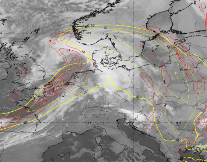 Right: IR 10.8 μm imagery from 1 December 2021 at 06:00 UTC. Isotachs at 300 hPa in yellow and PVA at 300 hPa in red.