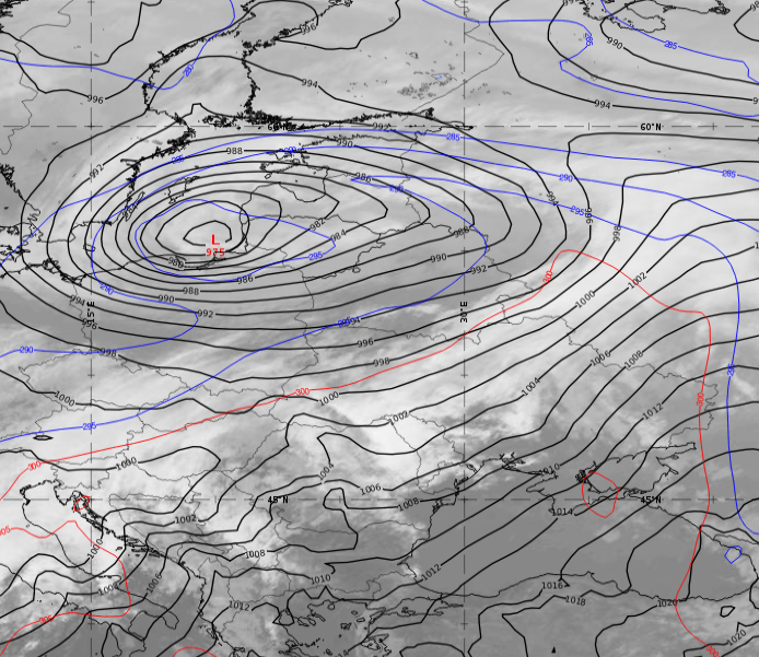 Right: IR 10.8 μm imagery from 30 November 2021 at 21:00 UTC. Mean surface pressure (black) and ThetaE at 700 hPa (blue and red isolines).