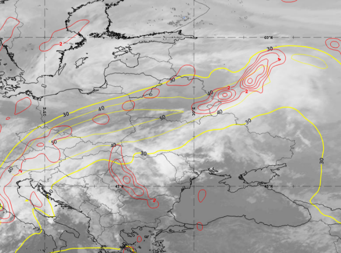 Right: IR 10.8 μm imagery from 30 November 2021 at 21:00 UTC. Isotachs and cyclonic vorticity advection at 300 hPa.
