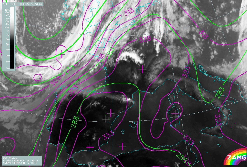 03 July 2005/18.00 UTC - Meteosat 8 IR10.8 image; green: equivalent thickness, magenta: Equivalent potential temperature 850 hPa