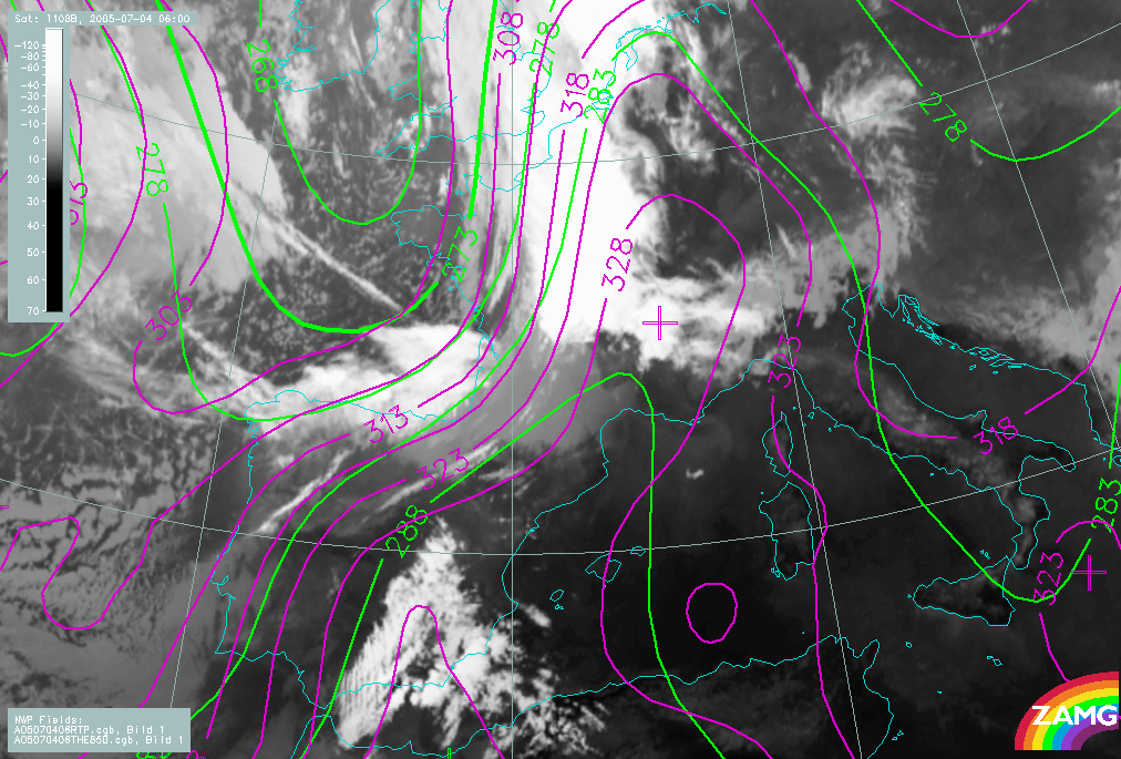 04 July 2005/06.00 UTC - Meteosat 8 IR10.8 image; green: equivalent thickness, magenta: Equivalent potential temperature 850 hPa