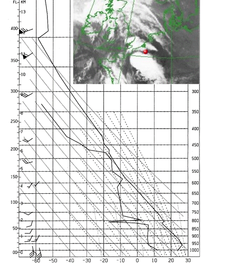 27 June 2001/00.00 UTC - Radiosounding Uccle; The location of Uccle (06447) is shown in the Meteosat 7 IR image from 27 June 2001/00.00 UTC at the upper right corner of the sounding graph