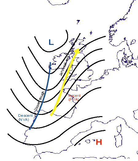 The Spanish Plume is, by definition, an incident where warm air is lifted from the Spanish plateau ahead of an eastward-moving upper-level trough over the Bay of Biscay. In conventional upper-air and surface synoptic maps this incident can typically be illustrated as follows: