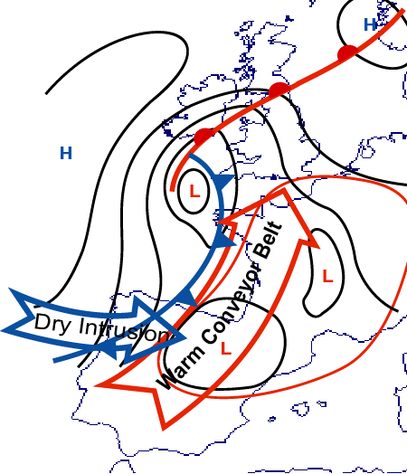 Low-level flow within Spanish plume. Open red arrow: the warm conveyor belt; open blue arrow: the dry intrusion. Area within red solid line: a typical area of high ThetaE values at 850 hPa. Black solid lines: surface isobars. Classical surface fronts also shown