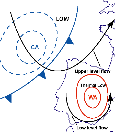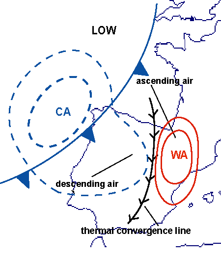 The strong heating of air near the surface over the Spanish plateau causes convergence and ascent, enhanced by the dynamical forcing of the eastwards moving upper-level trough. This leads to the formation of a thermal low over the Iberian Peninsula. The thermal low sets up a low-level cyclonic flow over the peninsula (Phase A), which includes the formation of a convergence line over the plateau. This induces the advection of cooler air and descending motion across the coastal areas of the Iberian Peninsula and western France from the Bay of Biscay and warm air advection over the interior of the peninsula. Therefore in the area east of the surface trough the advection of warm air enhances the ascents within the warm plume (Phase B), further accelerating decrease of surface pressure.