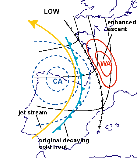 1. As the front approaches the continent, the existing thermal gradient intensifies. This causes the strengthening of winds ahead of the upper-level trough and wind adjustment in the lower levels; consequently an intensification of warm air advection and ascent within the warm plume ahead of the surface trough takes place (Phase C).