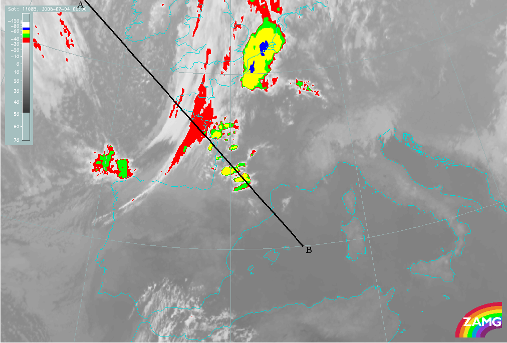 04 July 2005/00 UTC - Meteosat 8 IR10.8 image; position of vertical cross section indicated