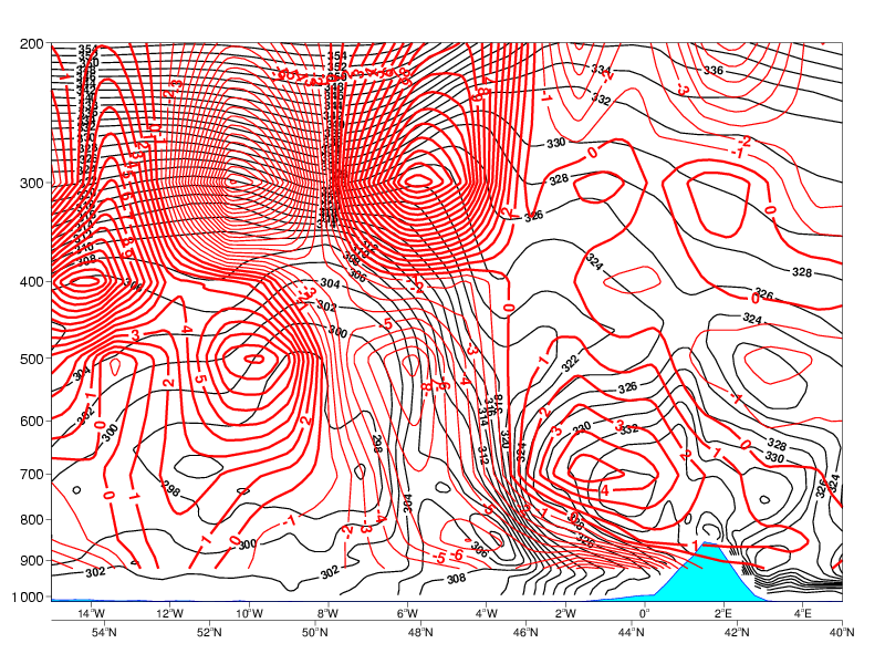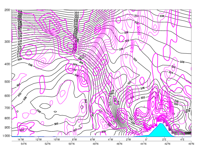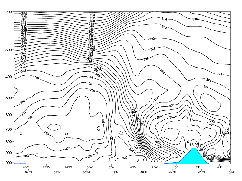 04 July 2005/00.00 UTC - Vertical cross section, black: isentropes (ThetaE)