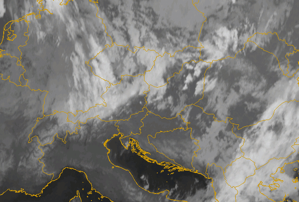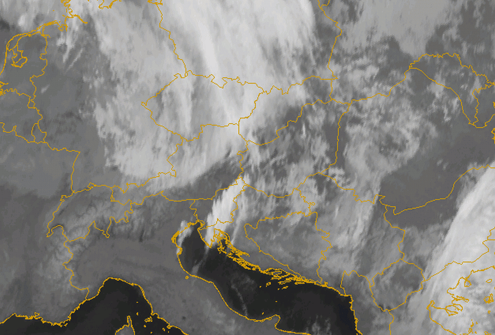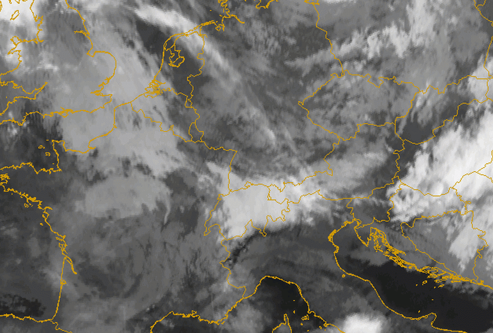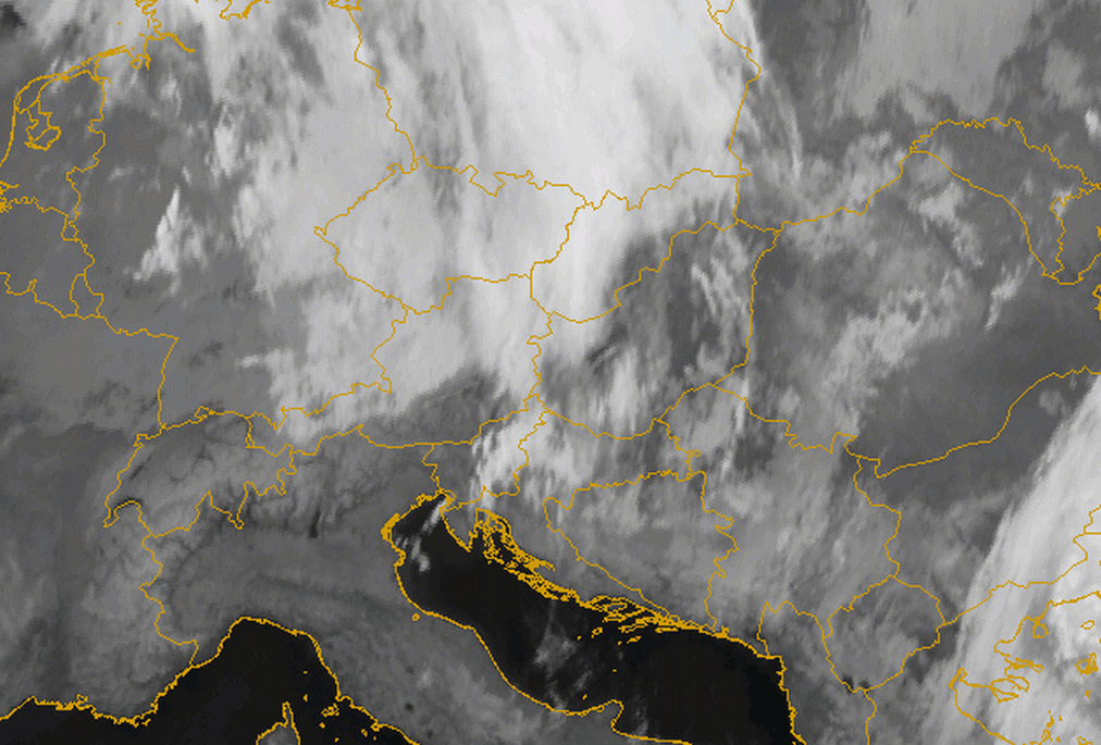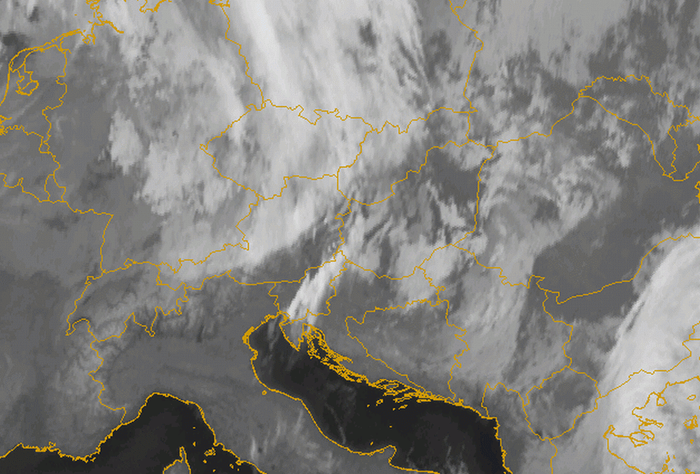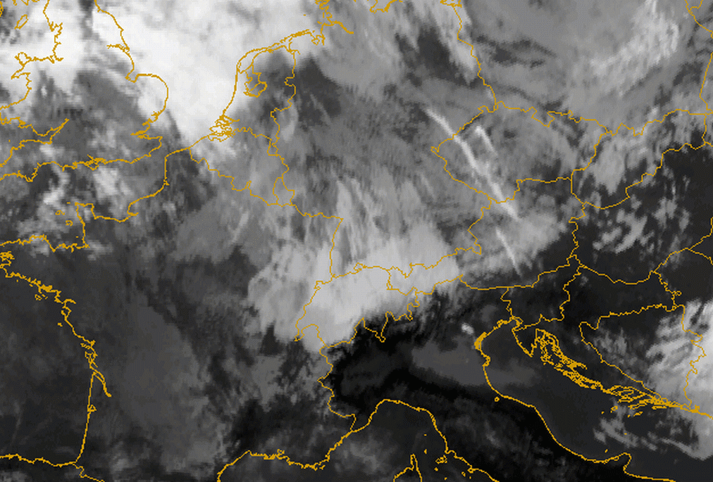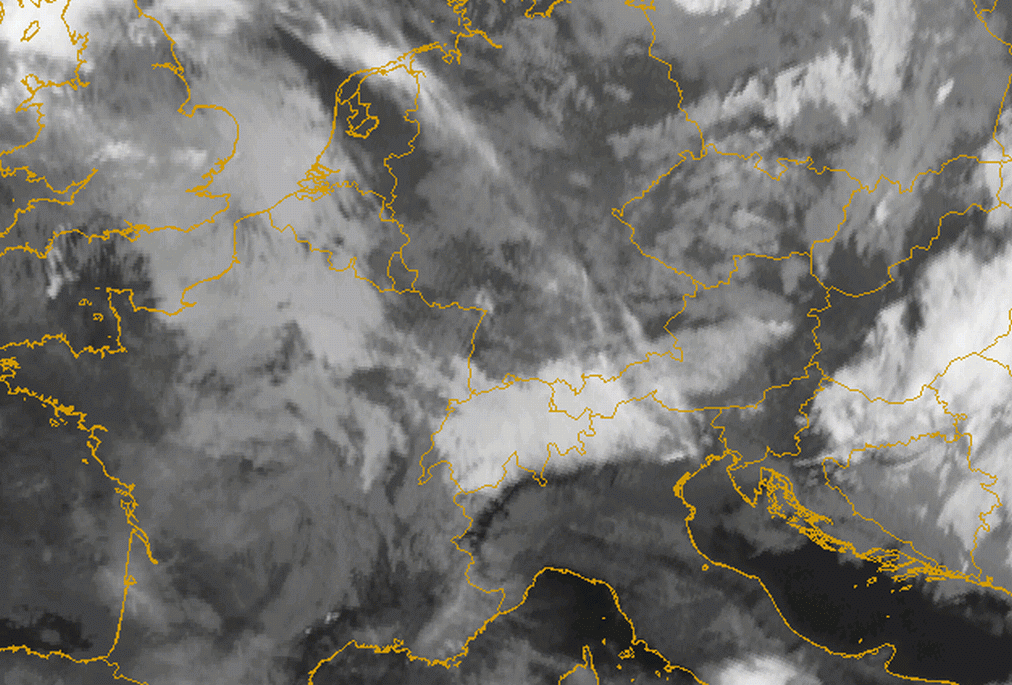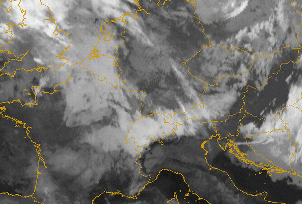 The IR10.8 image loop (above left) shows the passage of a front. It clearly shows the development of remaining cloudiness as Barrage on the north side of the Alps. To the south some lee waves are being formed just of the Alpine barrier. The behaviour of the Barrage cloudiness in the loop can be seen as a stationary cloud sheet directly above the windward slopes and main mountain ridge in Austria, extending upstream towards Germany and the Czech Republic.