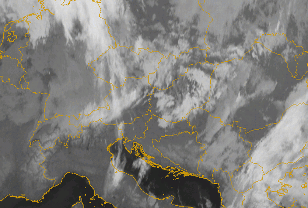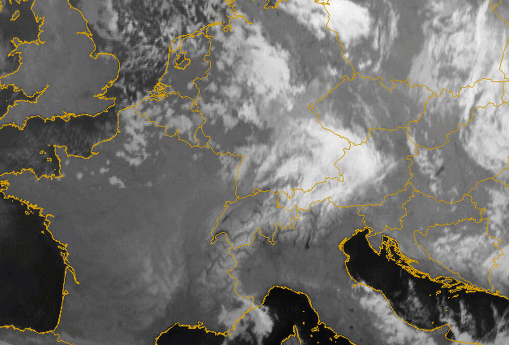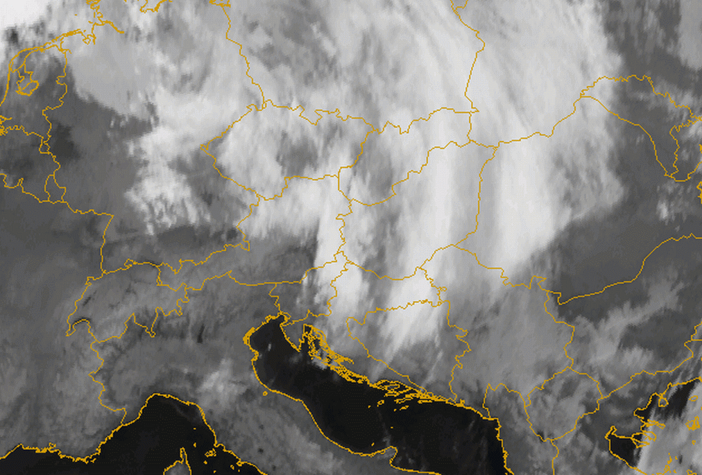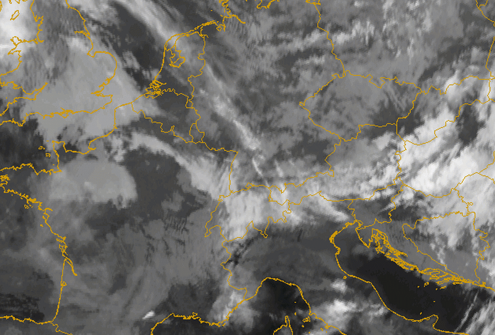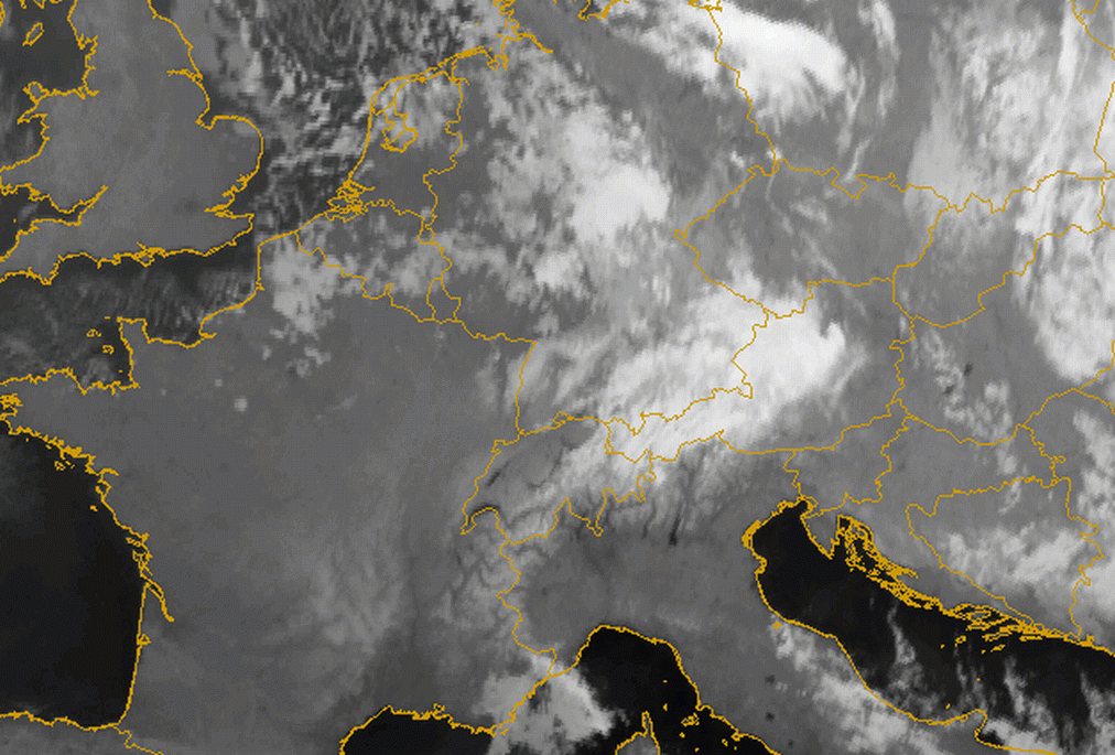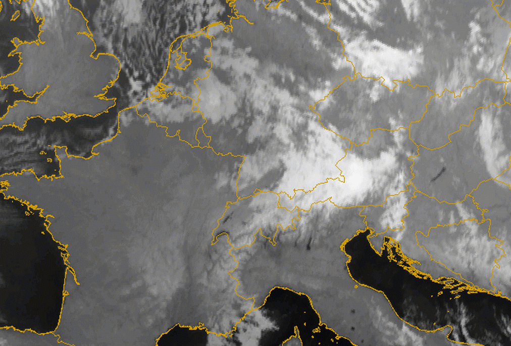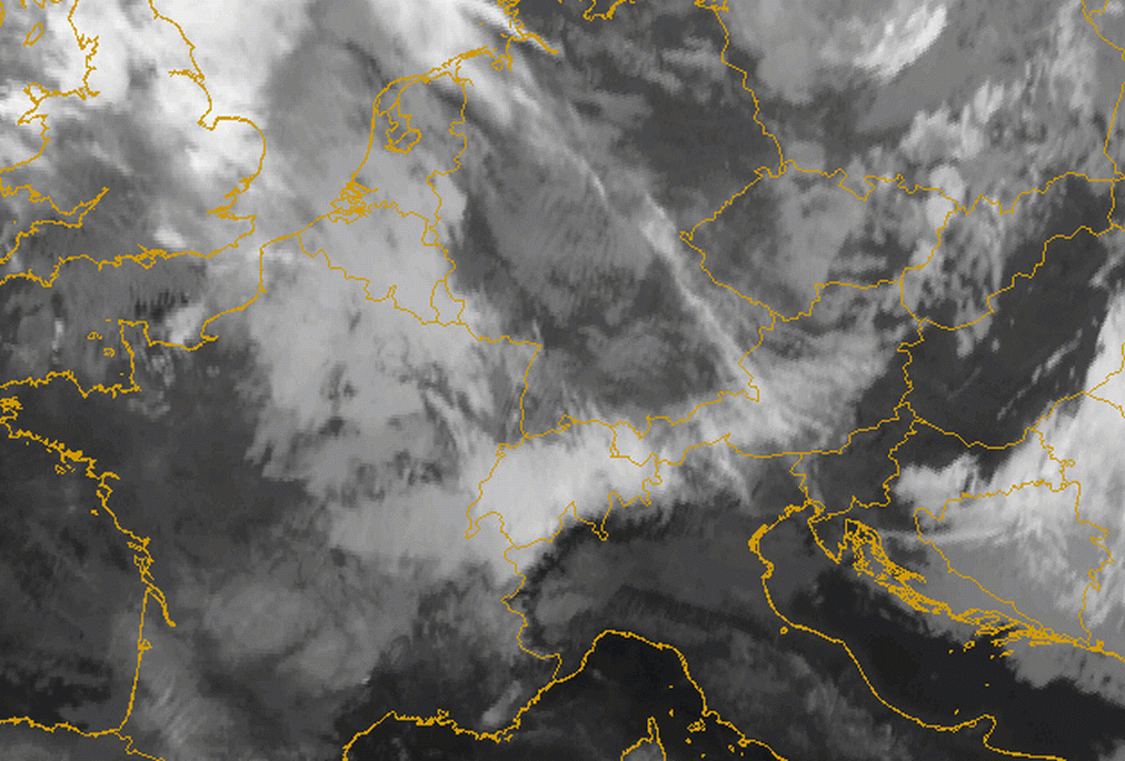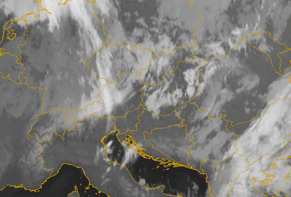 The IR10.8 image loop (above left) shows the passage of a front. It clearly shows the development of remaining cloudiness as Barrage on the north side of the Alps. To the south some lee waves are being formed just of the Alpine barrier. The behaviour of the Barrage cloudiness in the loop can be seen as a stationary cloud sheet directly above the windward slopes and main mountain ridge in Austria, extending upstream towards Germany and the Czech Republic.