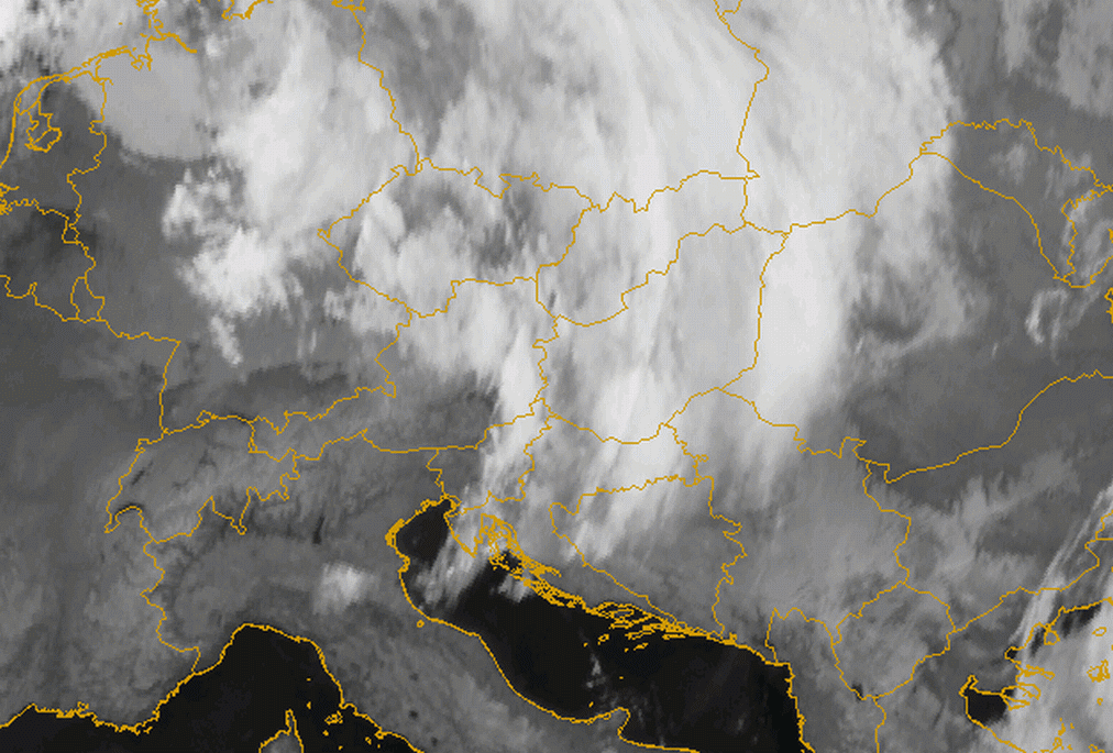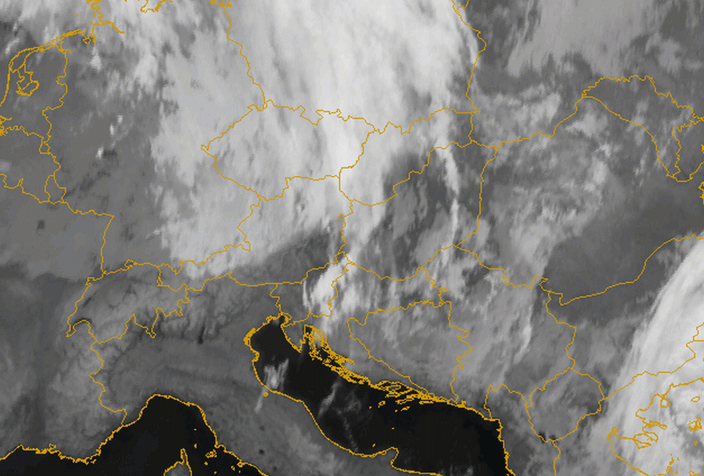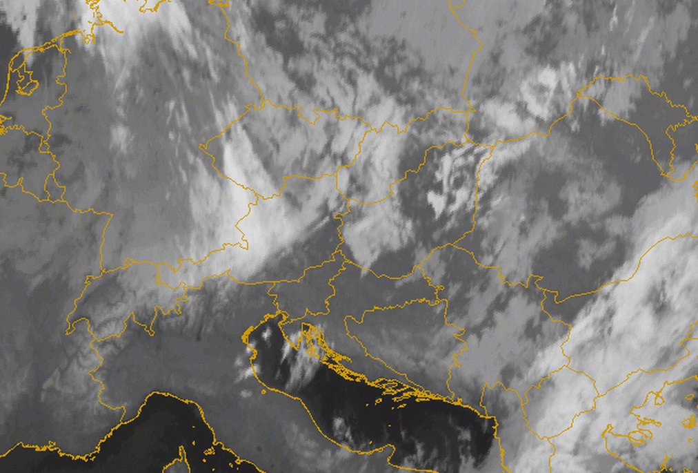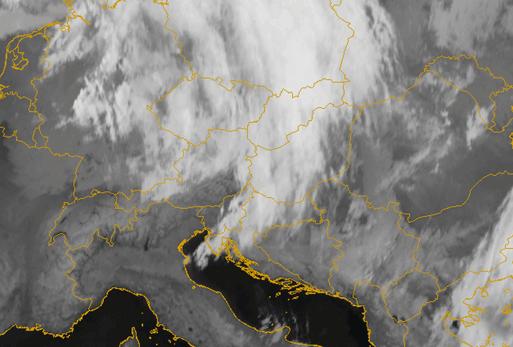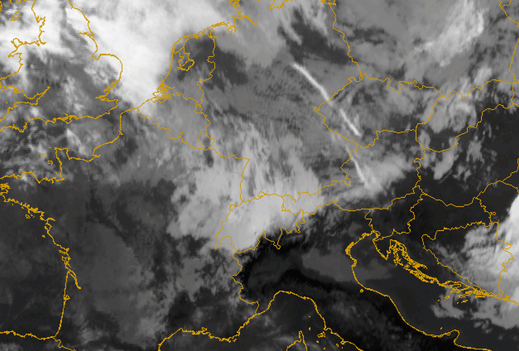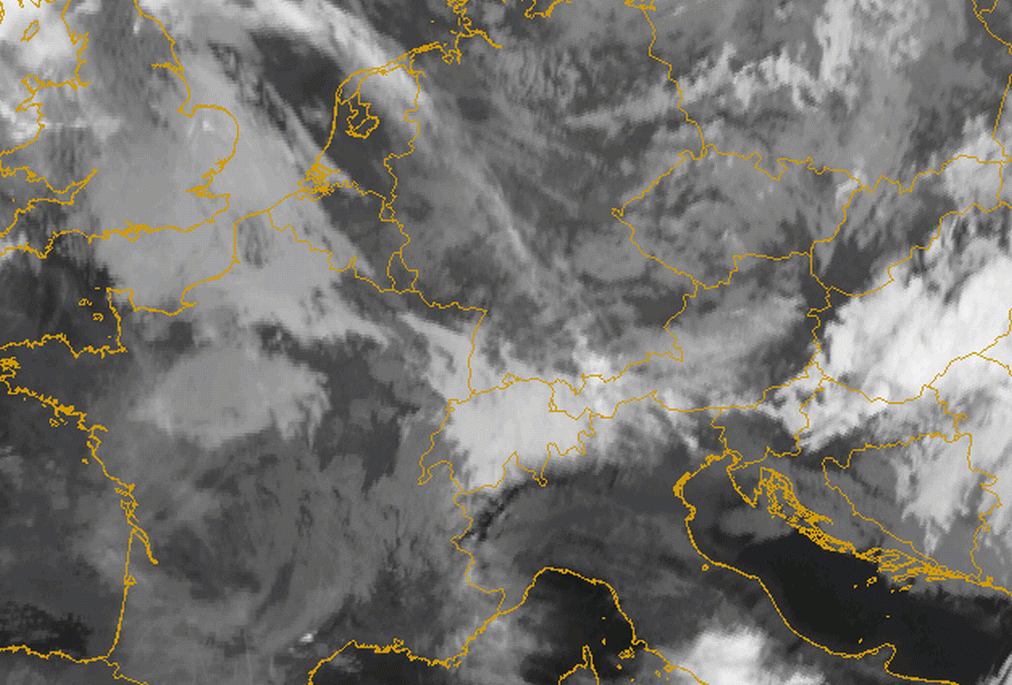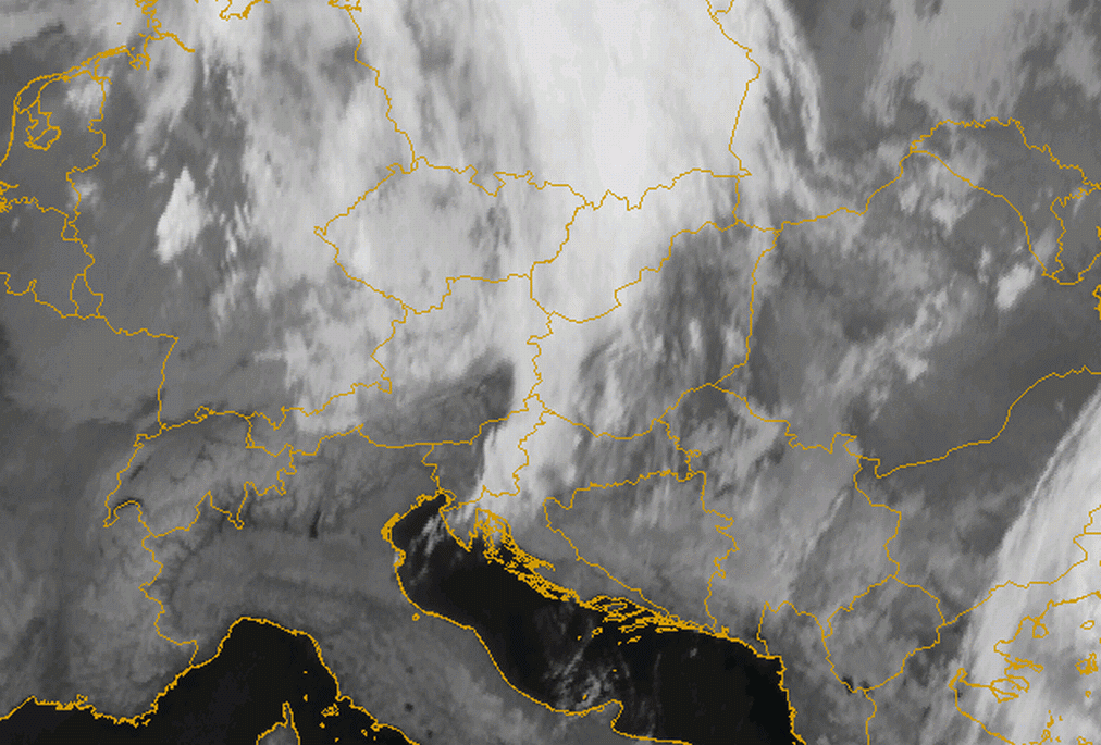 The IR10.8 image loop (above left) shows the passage of a front. It clearly shows the development of remaining cloudiness as Barrage on the north side of the Alps. To the south some lee waves are being formed just of the Alpine barrier. The behaviour of the Barrage cloudiness in the loop can be seen as a stationary cloud sheet directly above the windward slopes and main mountain ridge in Austria, extending upstream towards Germany and the Czech Republic.