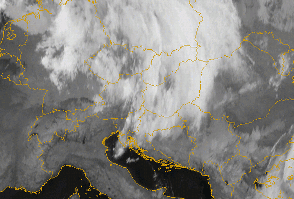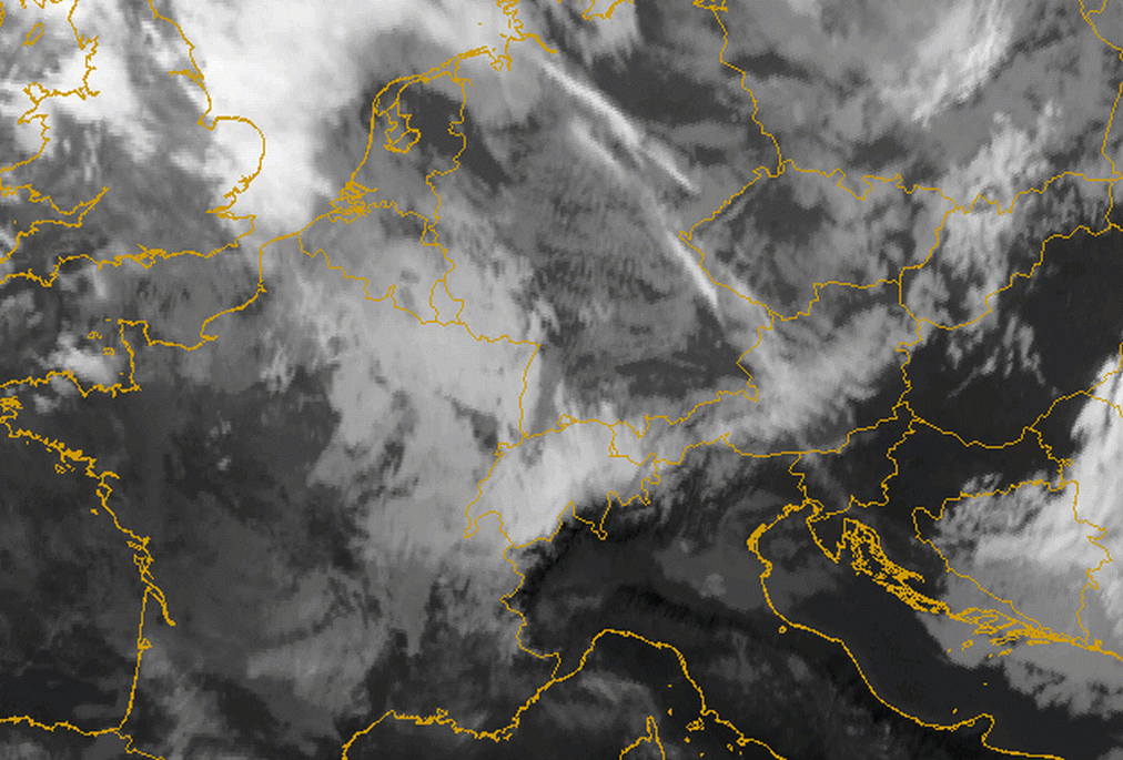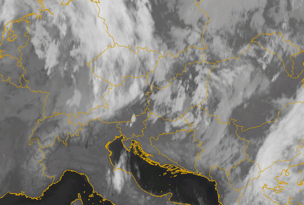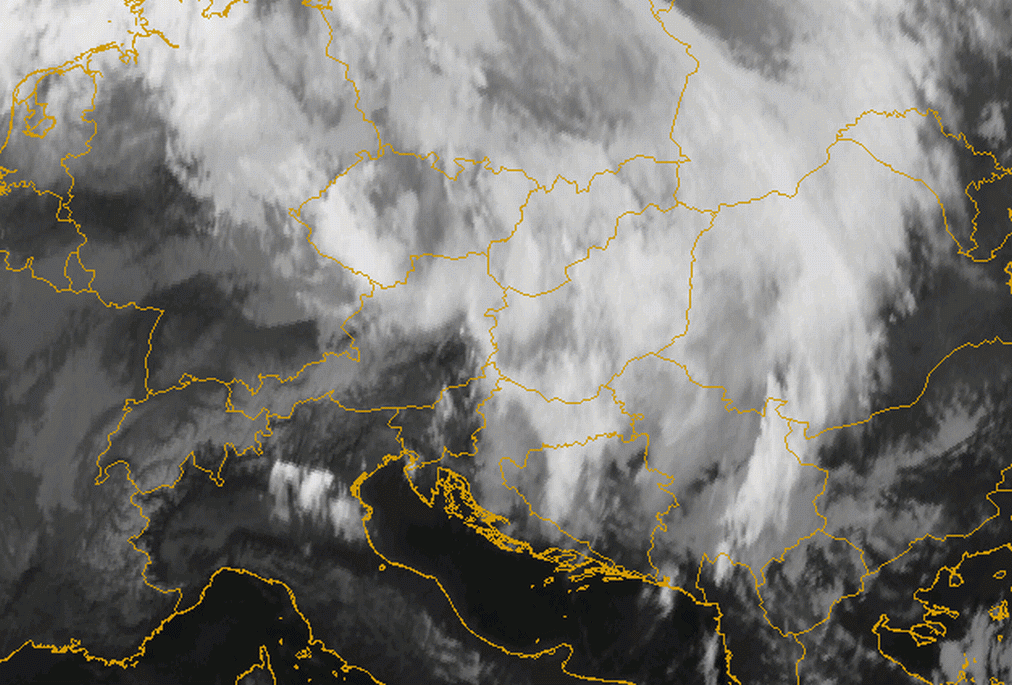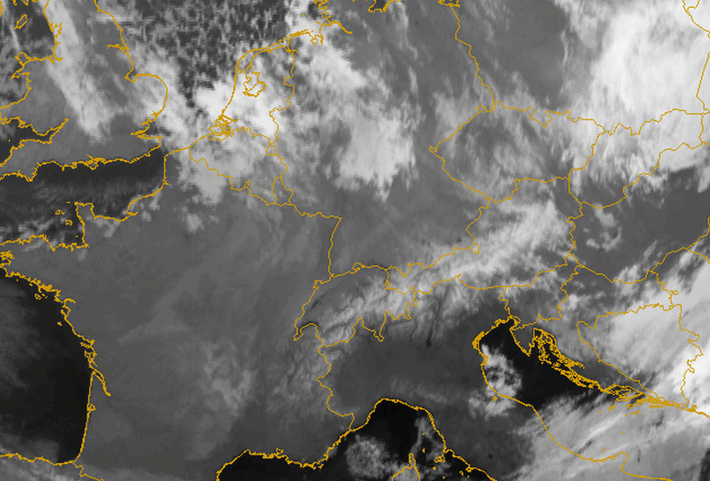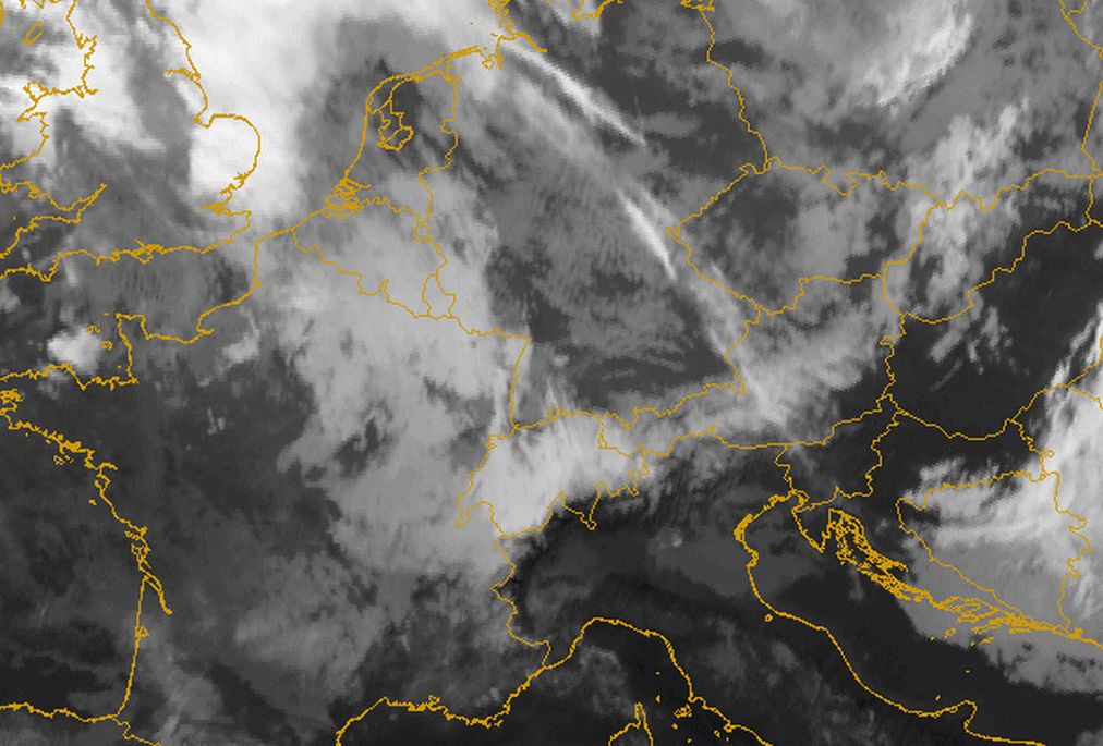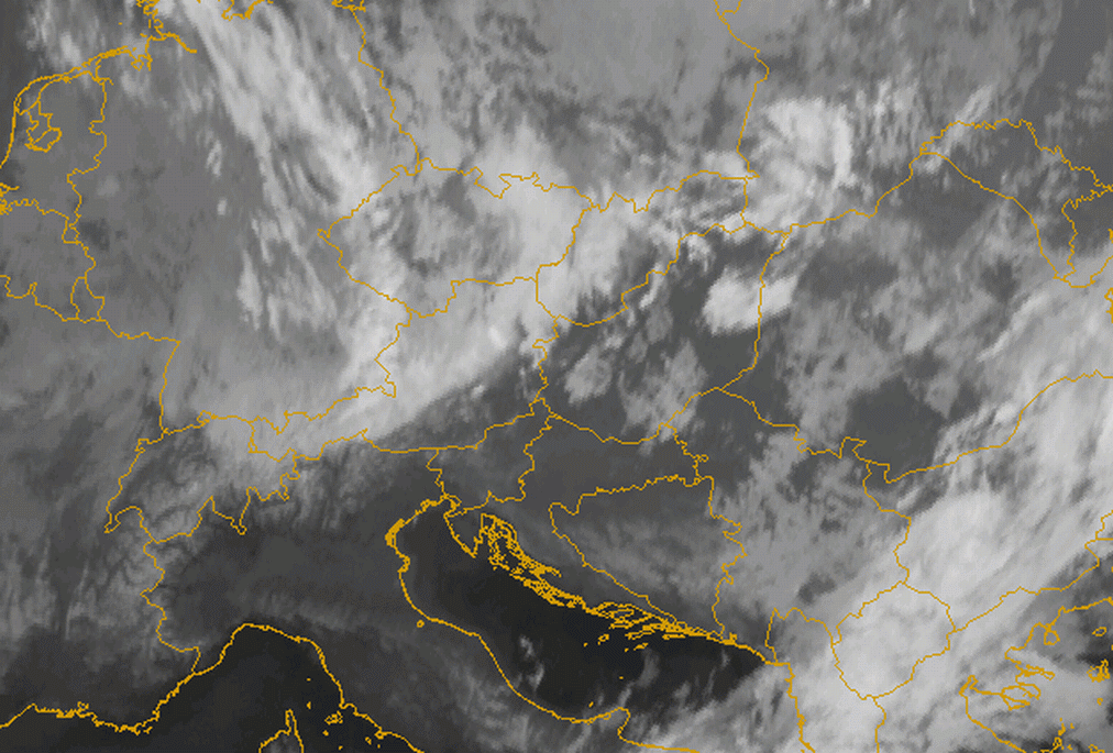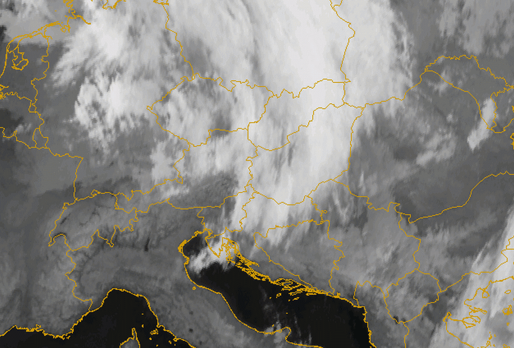 The IR10.8 image loop (above left) shows the passage of a front. It clearly shows the development of remaining cloudiness as Barrage on the north side of the Alps. To the south some lee waves are being formed just of the Alpine barrier. The behaviour of the Barrage cloudiness in the loop can be seen as a stationary cloud sheet directly above the windward slopes and main mountain ridge in Austria, extending upstream towards Germany and the Czech Republic.
