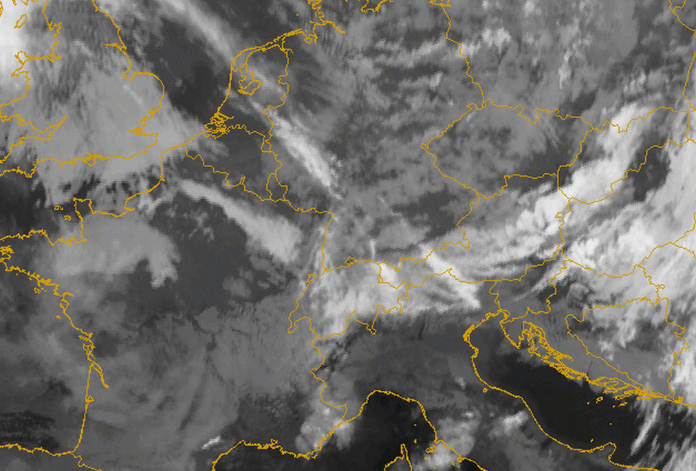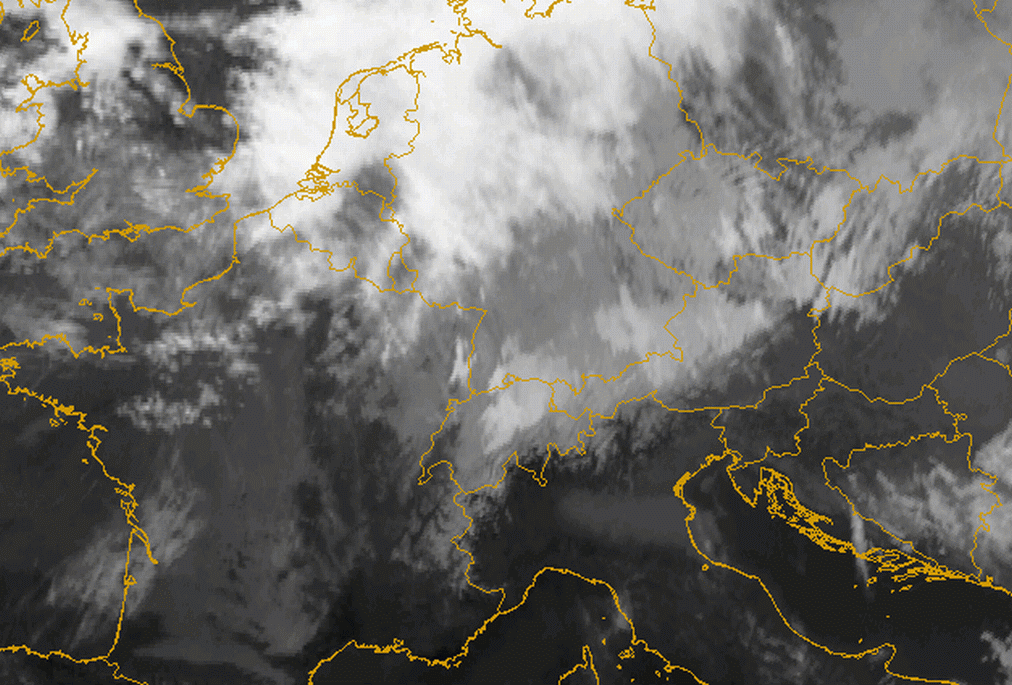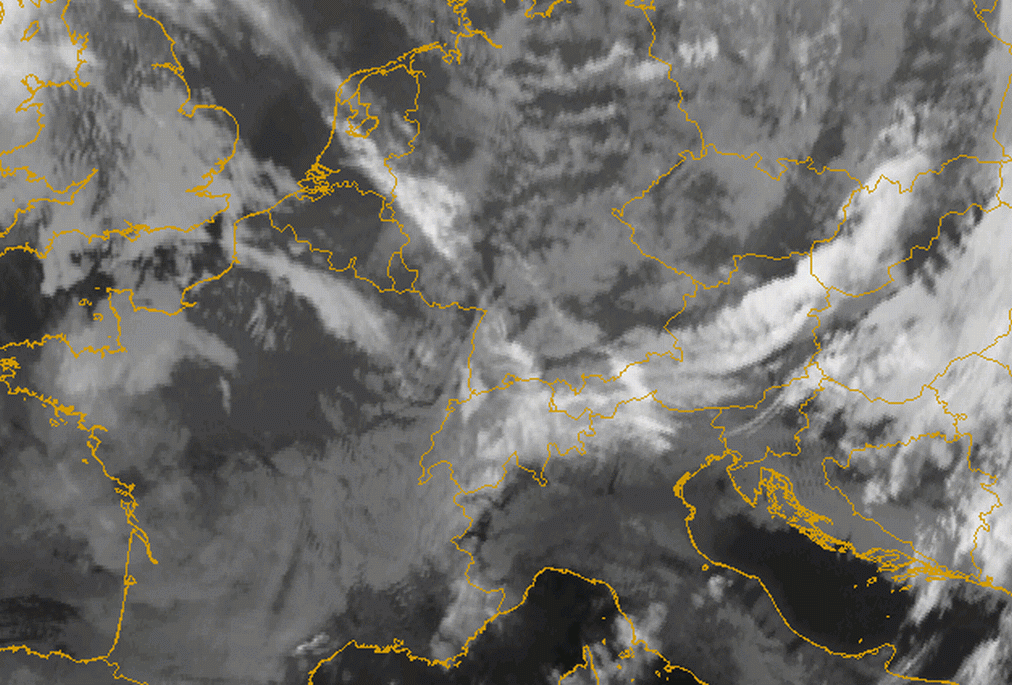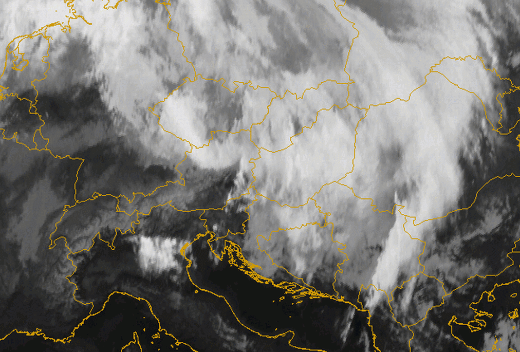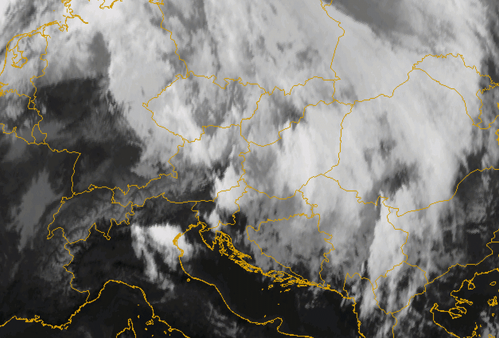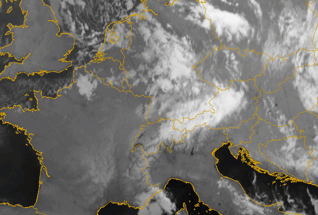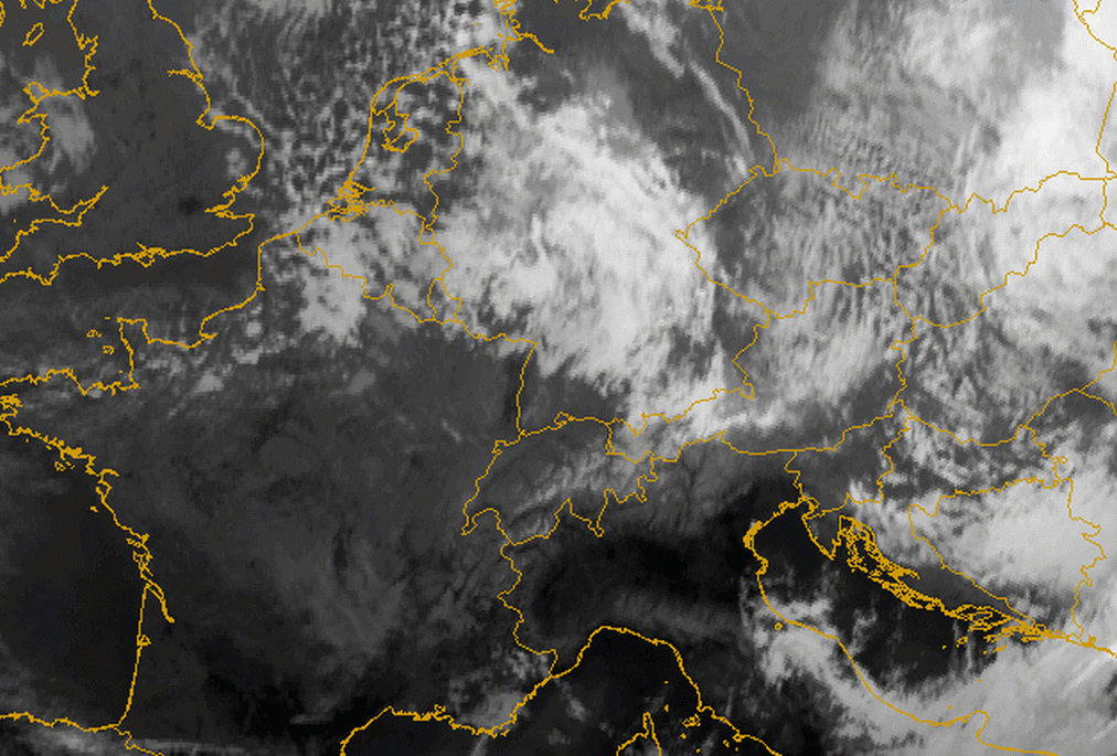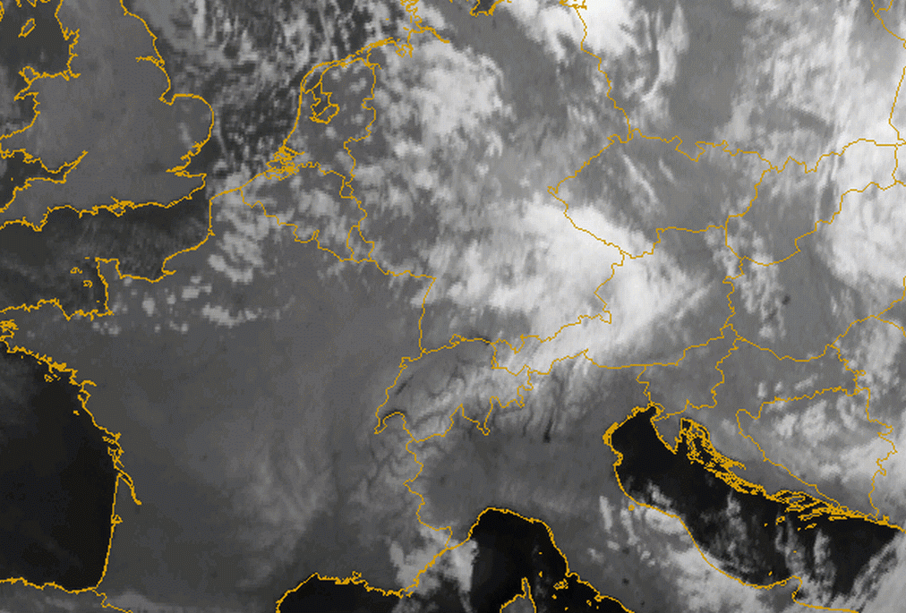 The IR10.8 image loop (above left) shows the passage of a front. It clearly shows the development of remaining cloudiness as Barrage on the north side of the Alps. To the south some lee waves are being formed just of the Alpine barrier. The behaviour of the Barrage cloudiness in the loop can be seen as a stationary cloud sheet directly above the windward slopes and main mountain ridge in Austria, extending upstream towards Germany and the Czech Republic.