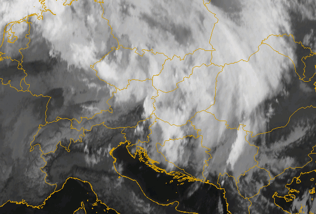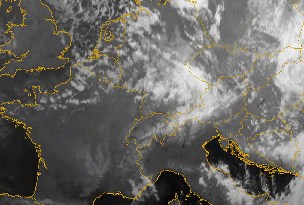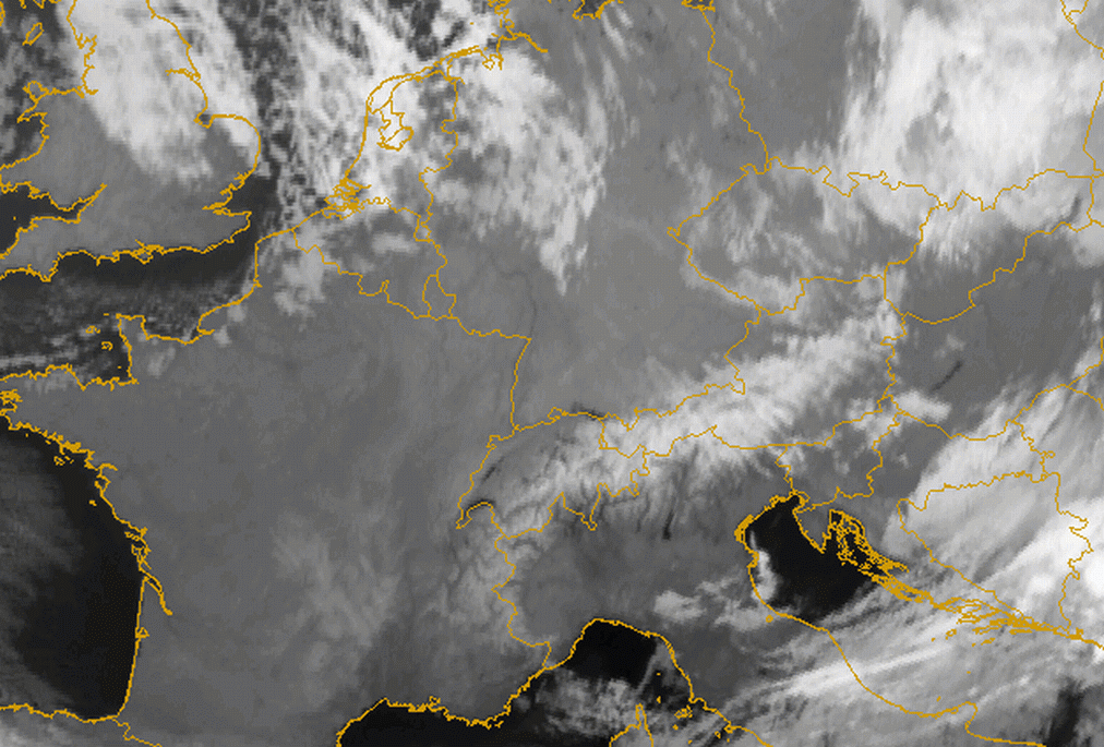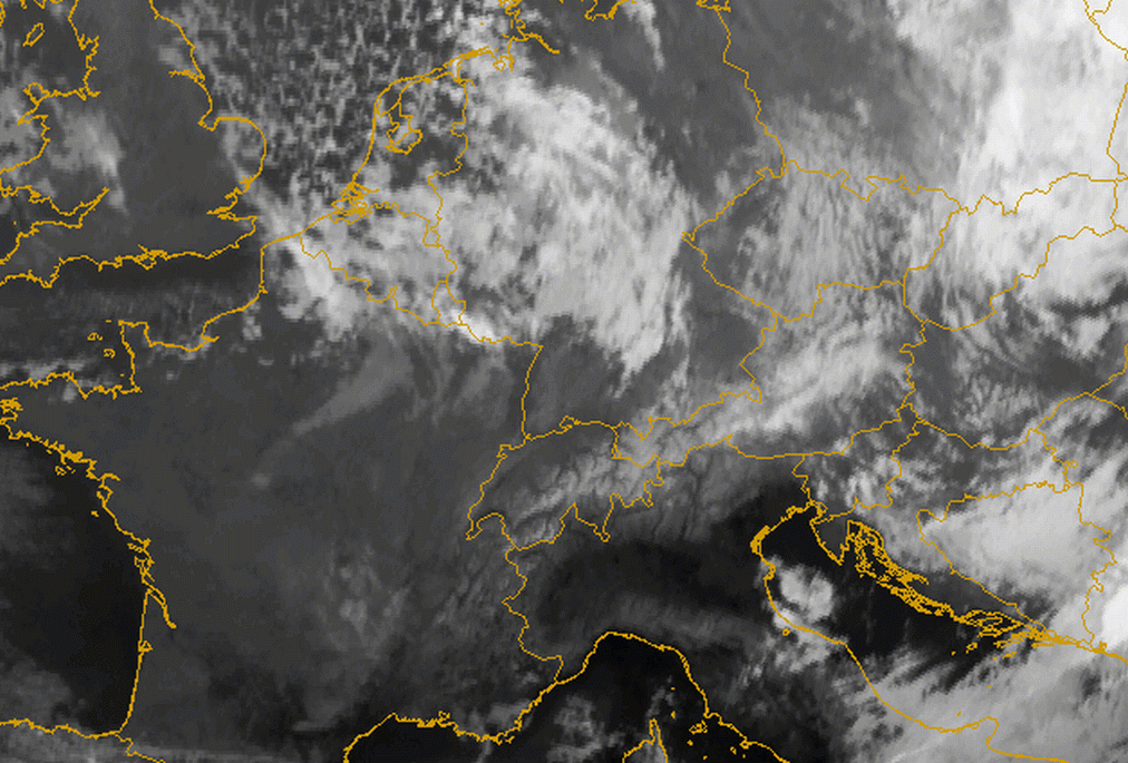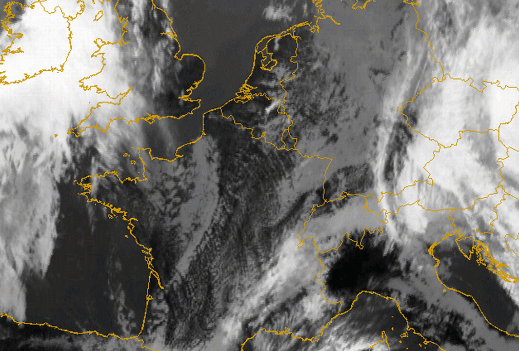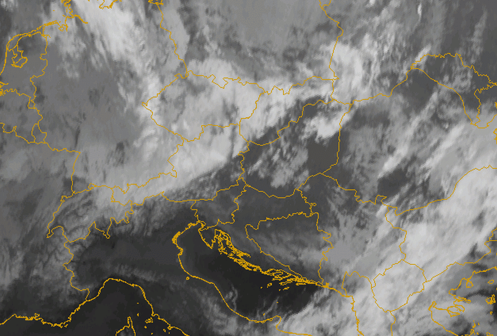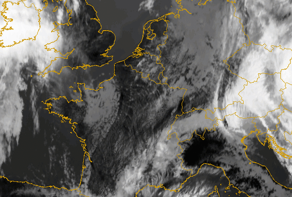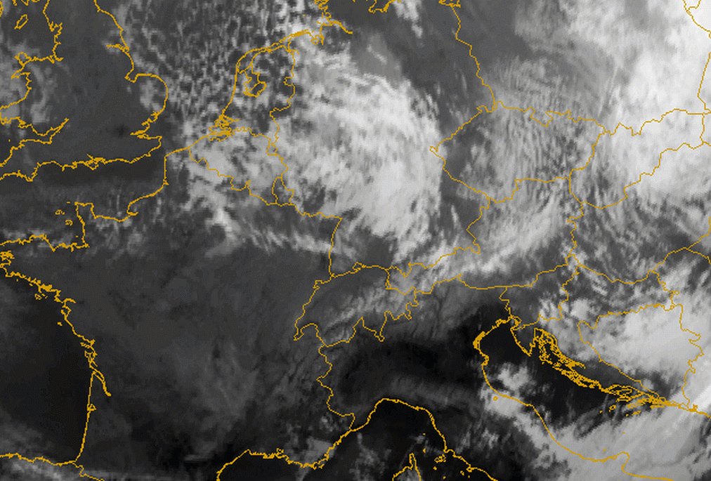The IR10.8 image loop (above left) shows the passage of a front. It clearly shows the development of remaining cloudiness as Barrage on the north side of the Alps. To the south some lee waves are being formed just of the Alpine barrier. The behaviour of the Barrage cloudiness in the loop can be seen as a stationary cloud sheet directly above the windward slopes and main mountain ridge in Austria, extending upstream towards Germany and the Czech Republic.