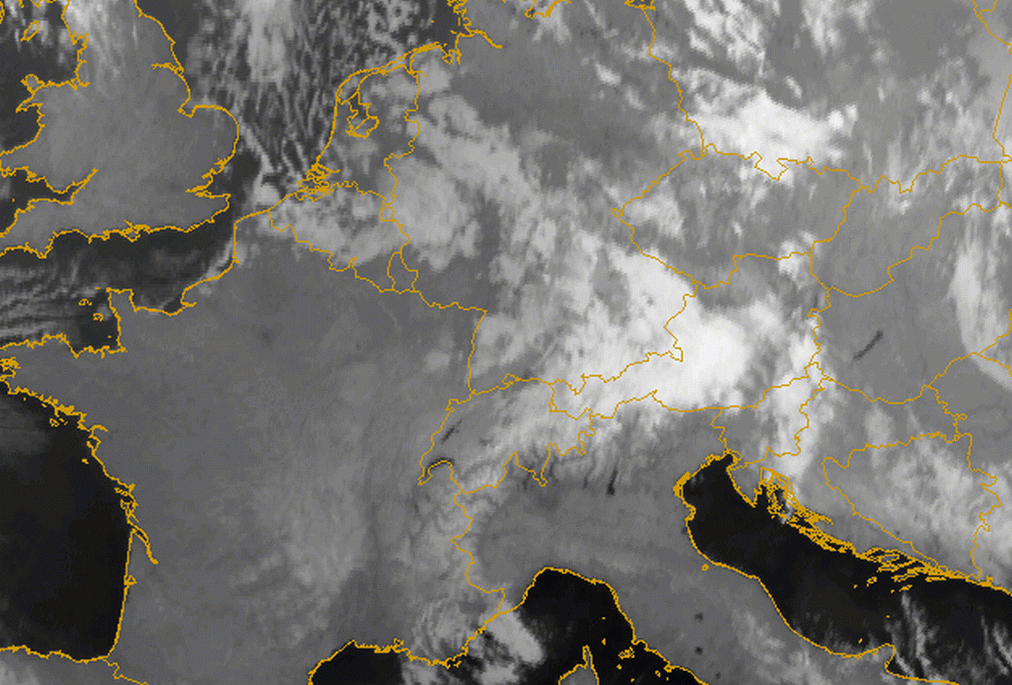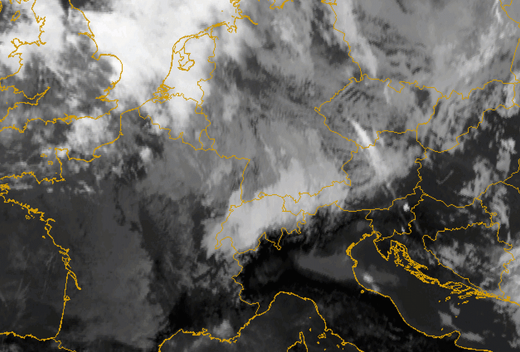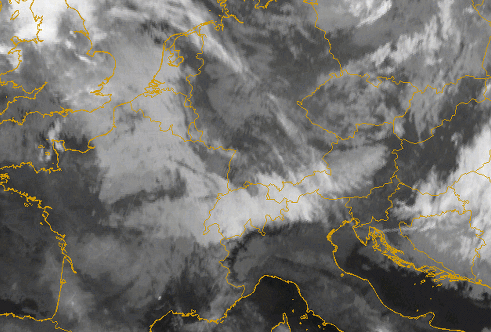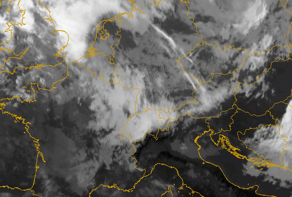 • A distinct cloud bulge forms along the western Alpine bow associated with a strong westerly flow towards the western boundary of the Alps.