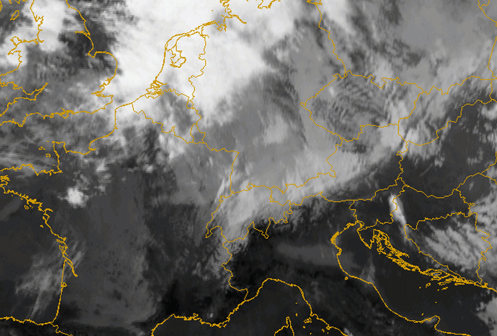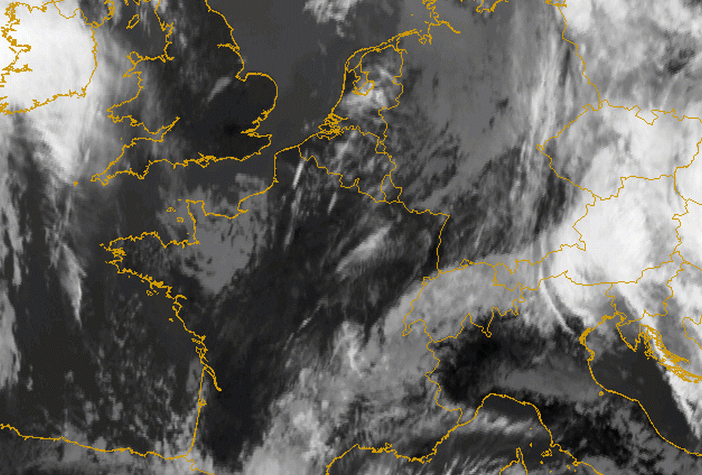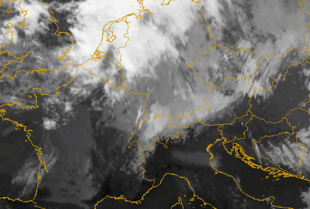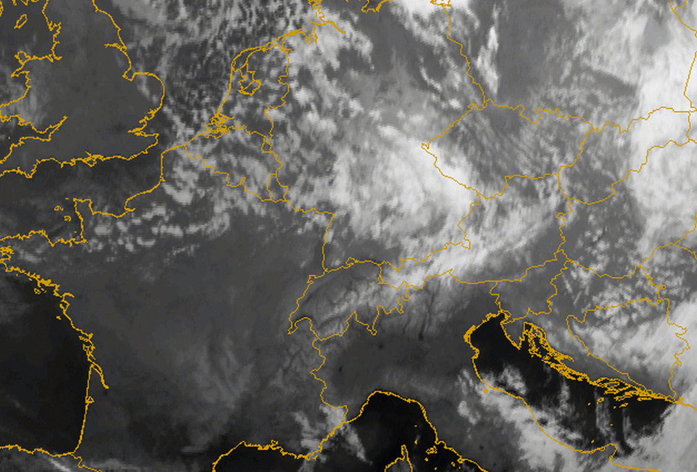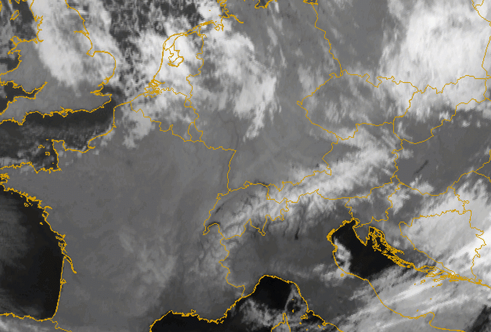 • A distinct cloud bulge forms along the western Alpine bow associated with a strong westerly flow towards the western boundary of the Alps.