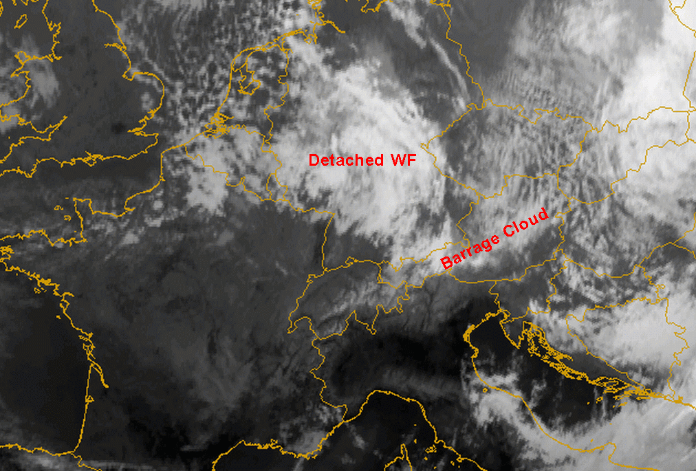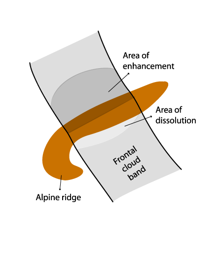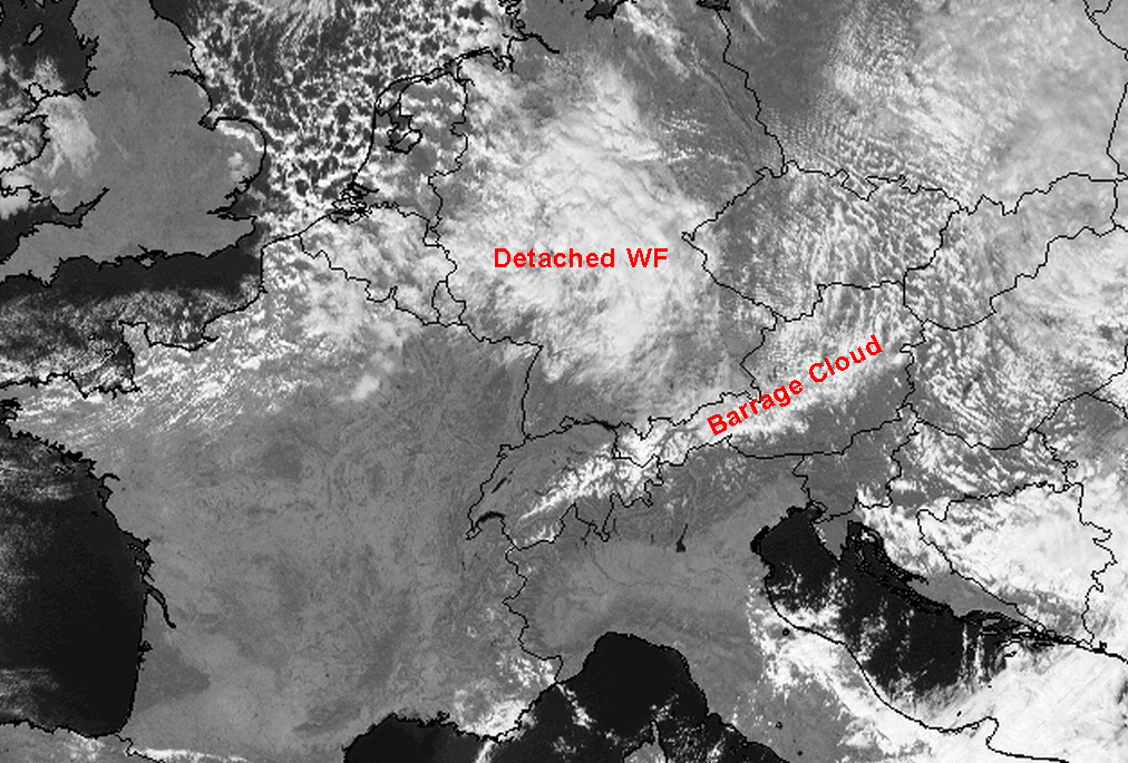 • The only indication of Barrage within the front is the enhancement of the frontal cloud band over the Alpine ridge as a result of forced ascent along the windward side. The sinking motion along the lee side results in cloud dissipation (see schematic below).