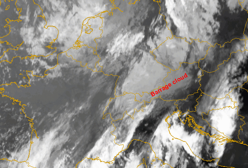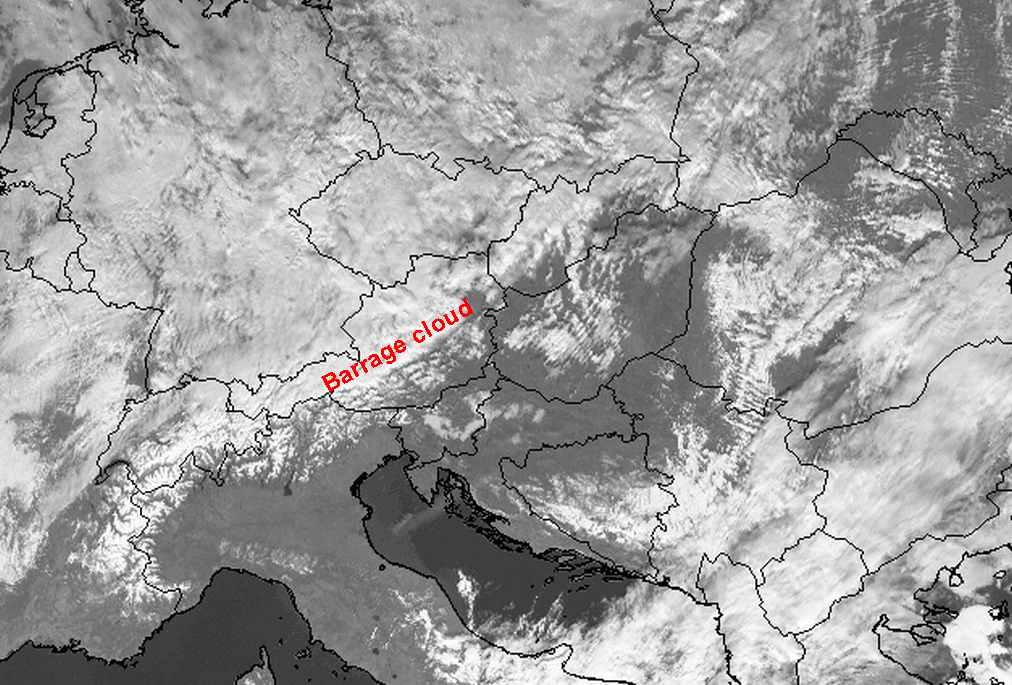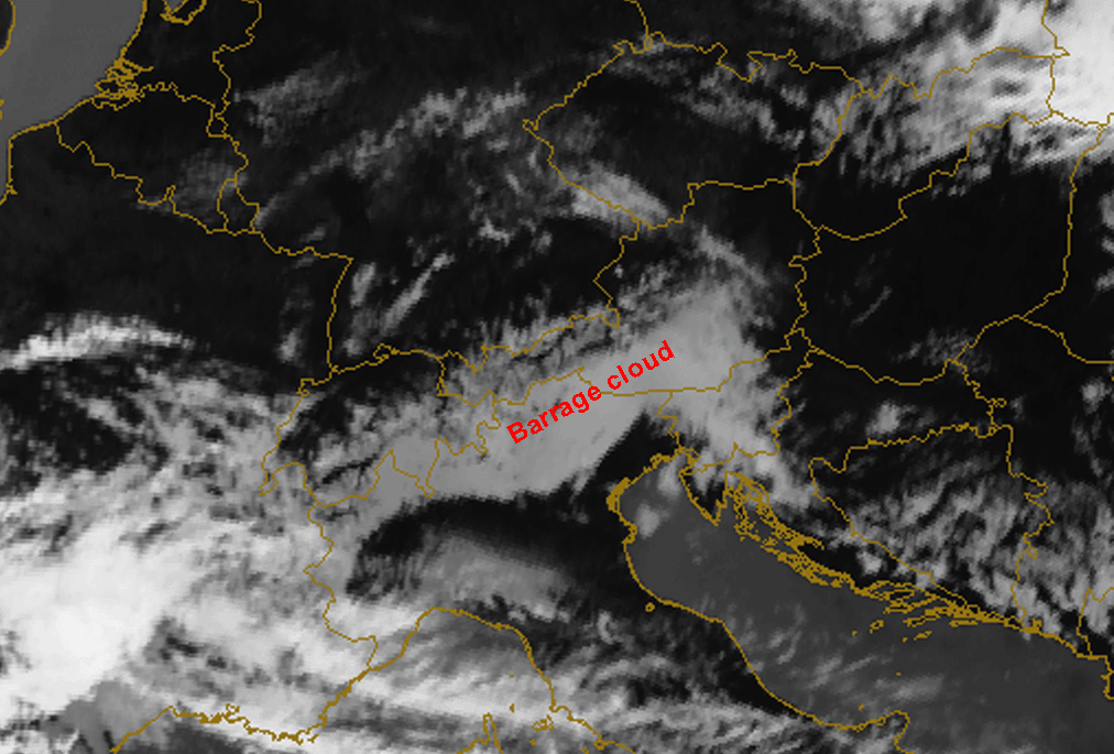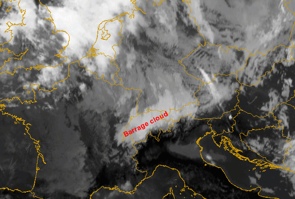 After the passage of a Cold Front, from Spain over E. France into Switzerland, Barrage cloudiness forms on the Western Alpine ridge. The Barrage cloudiness extends tangentially to the main Alpine ridge with a pronounced cloud bulge over the western Alpine bow.