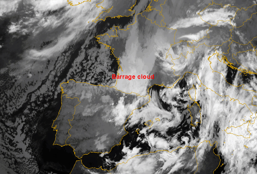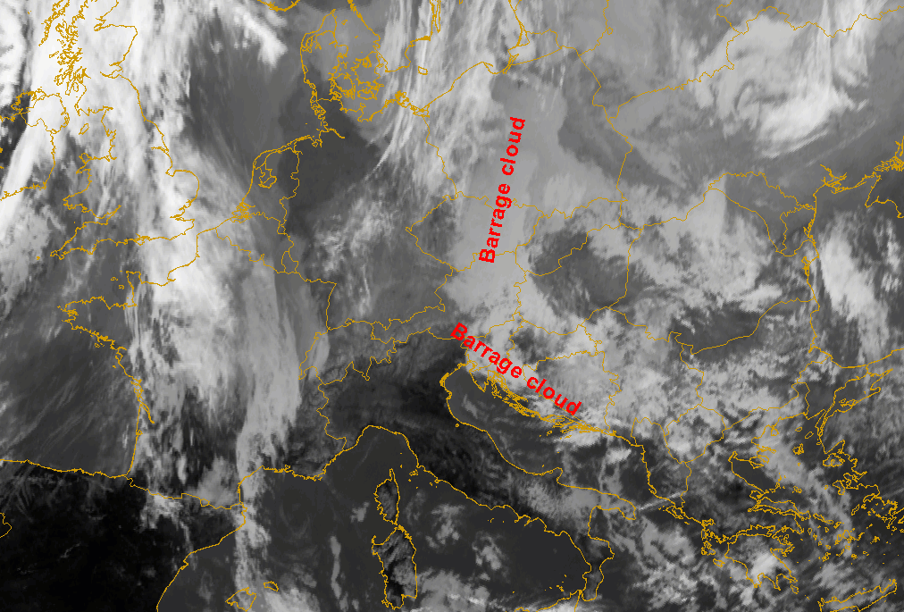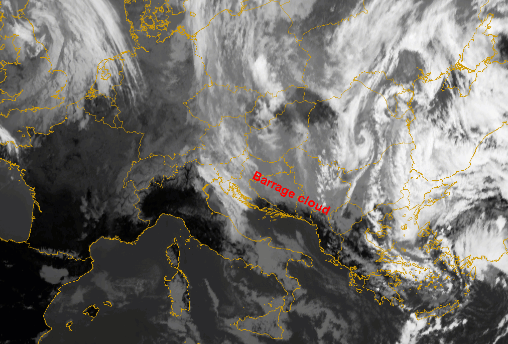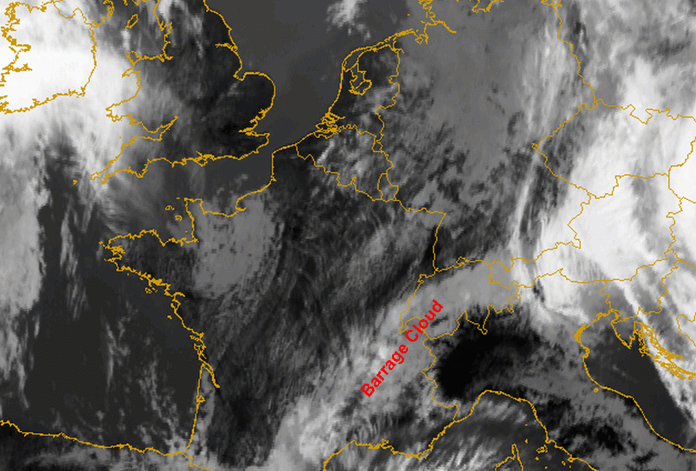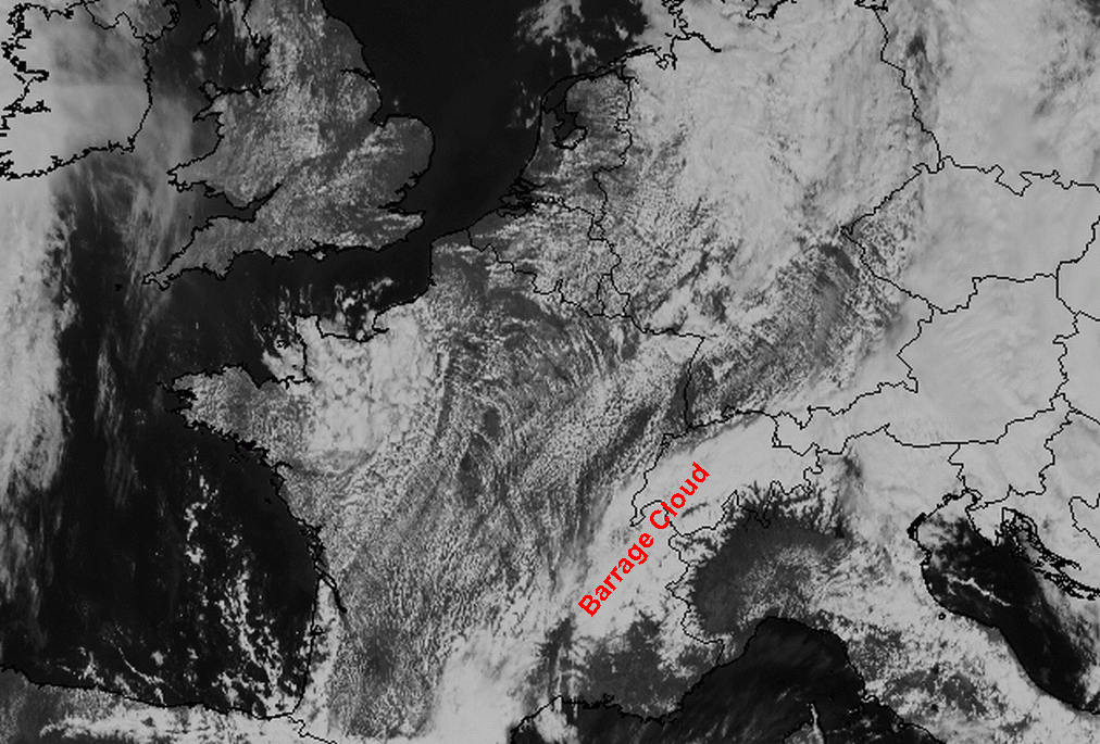 After the passage of a Cold Front, from Spain over E. France into Switzerland, Barrage cloudiness forms on the Western Alpine ridge. The Barrage cloudiness extends tangentially to the main Alpine ridge with a pronounced cloud bulge over the western Alpine bow.