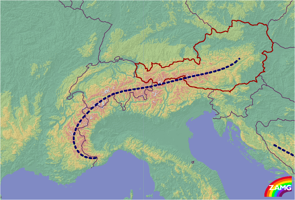 The schematic above shows the topographical distribution of the Alps with the main alpine ridge indicated (dashed blue).