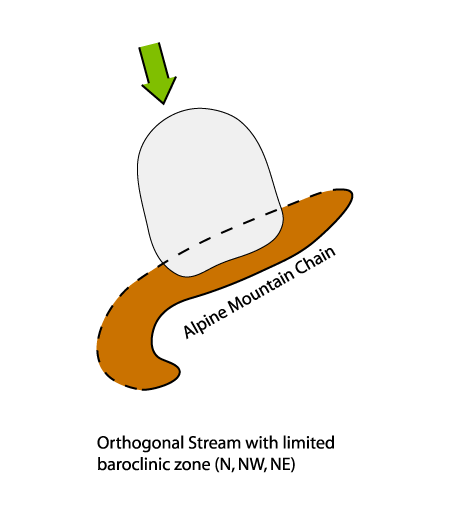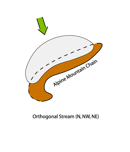 1. Orthogonal (right angle) stream to the main Alpine ridge