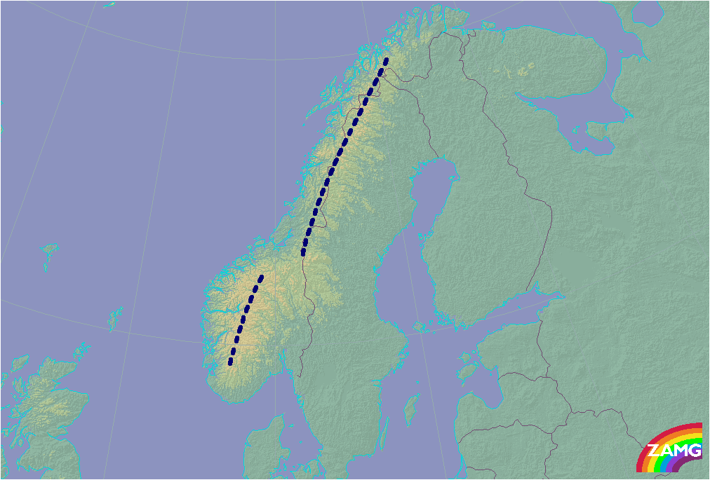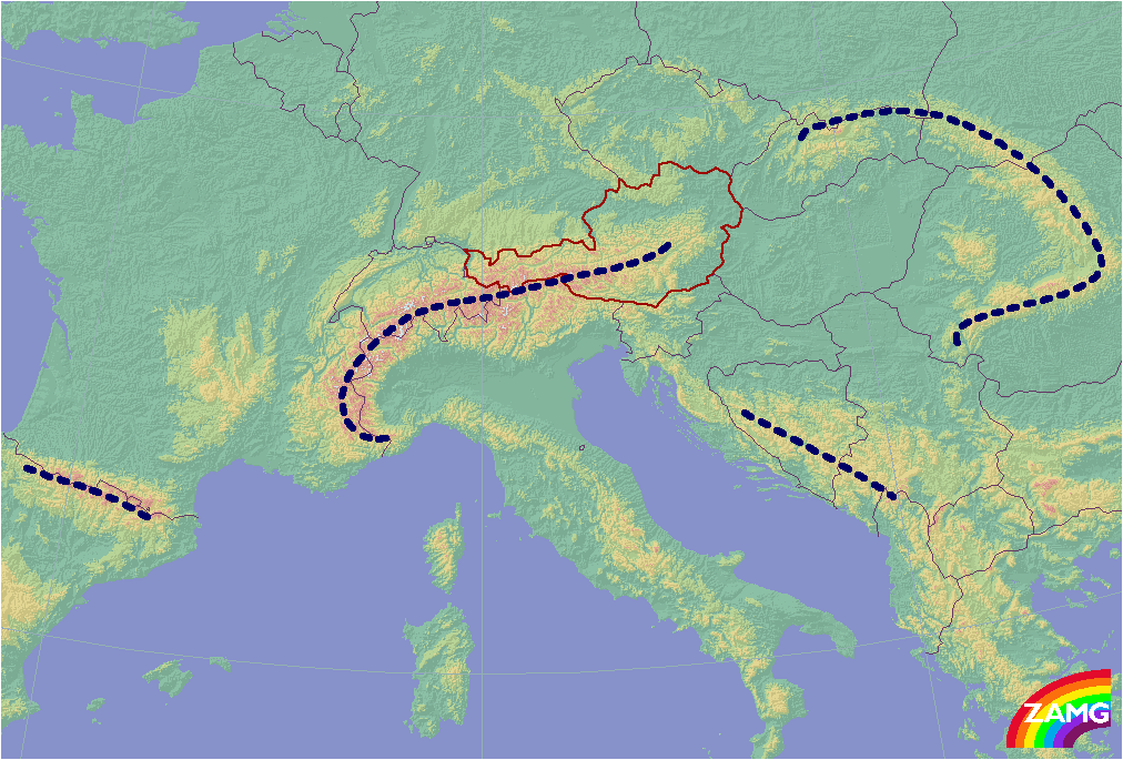 Barrage cloudiness in Europe is often observed over the Scandinavian Mountains, the Pyrenees, the Carpathian Mountains, the Dinarian Mountains and the Alps.