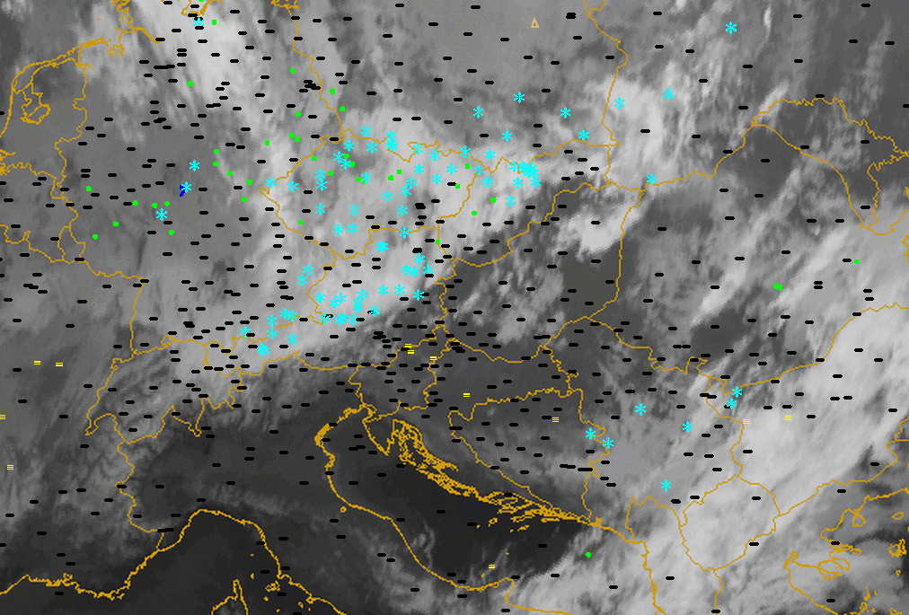 03 January 2005/12.00 UTC - Meteosat 8 IR10.8 image; weather events (green: rain and showers, blue: drizzle, cyan: snow, red: