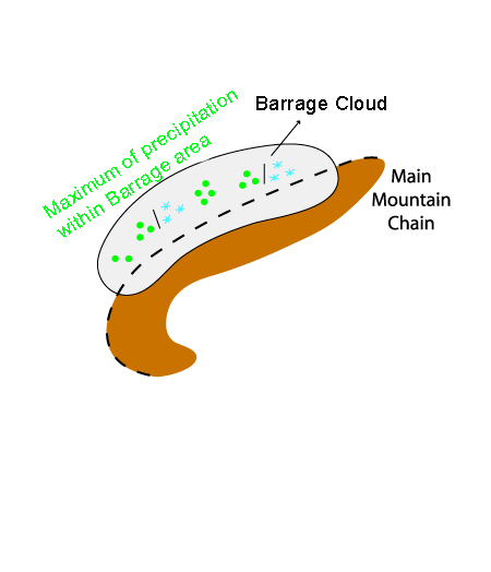 Barrage cloudiness forms if a flow of sufficiently moist air is forced to rise over a mountain barrier. This process generally results in prolonged precipitation.