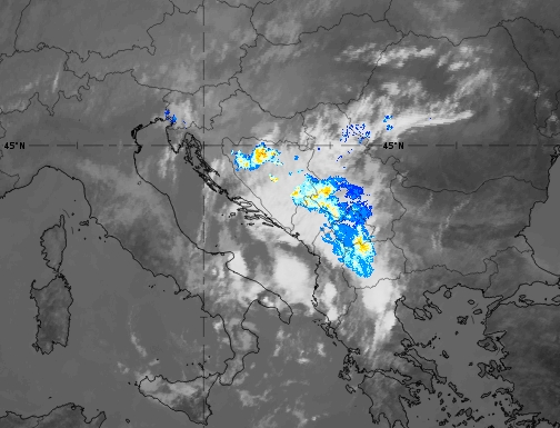 03 January 2005/12.00 UTC - Meteosat 8 IR10.8 image; weather events (green: rain and showers, blue: drizzle, cyan: snow, red: