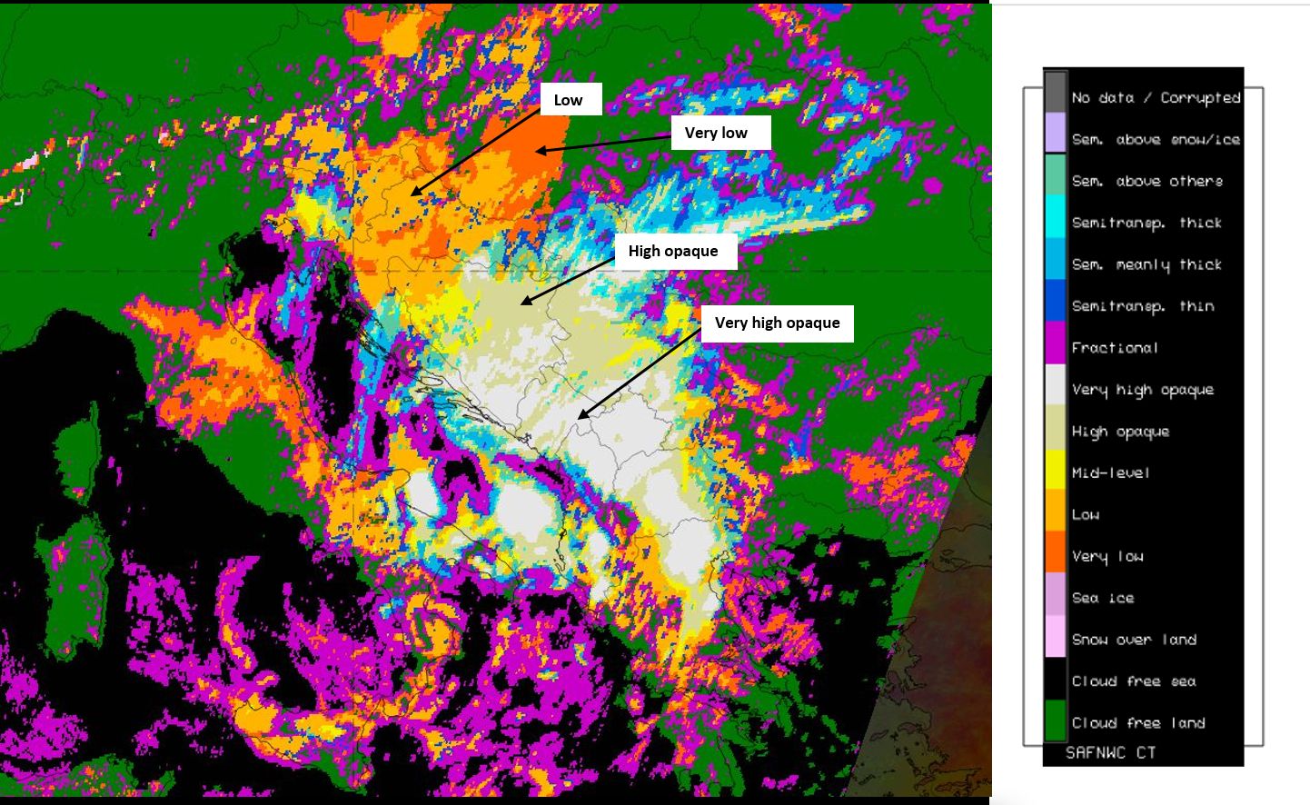 The Cloud Type analysis provides details of the height, transparency, thickness and type of the clouds. This can be very helpful information, for example during the night when VIS channels cannot be used, or to highlight specific features.
