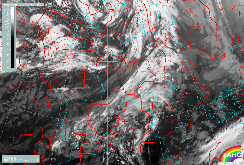09 January 2008/12.00 UTC - Meteosat 9 IR10.8 image; red dashed: temperature advection - CA 700 hPa, red solid: temperature