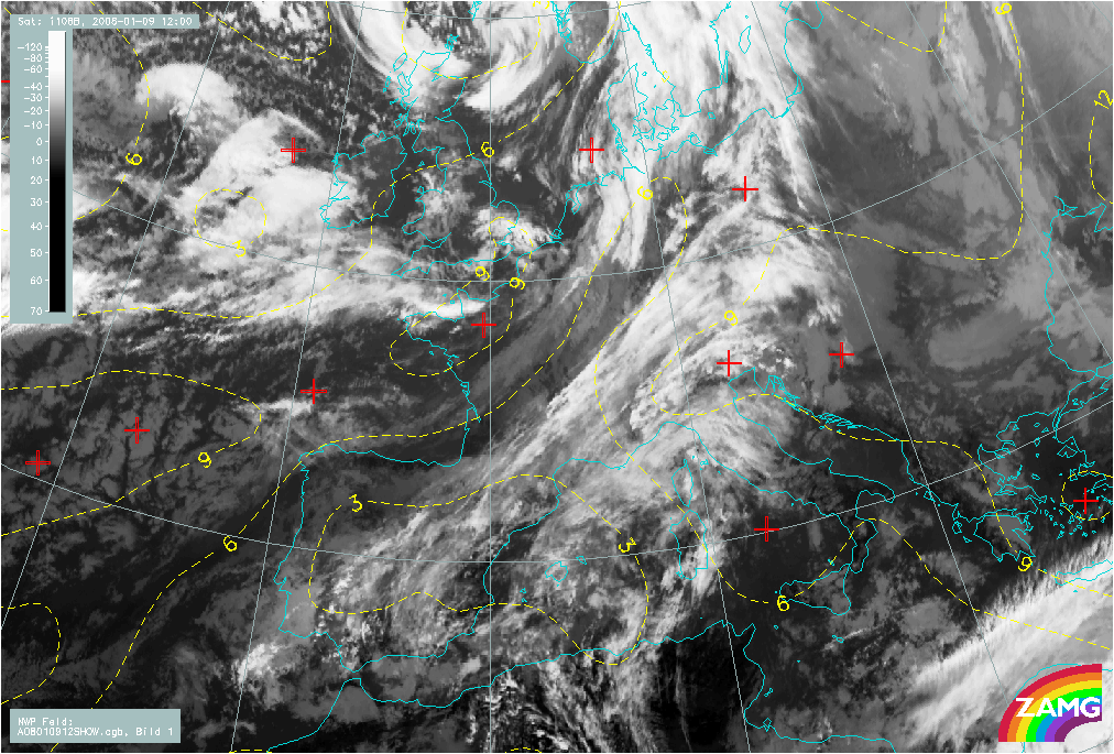 09 January 2008/12.00 UTC - Meteosat 9 IR10.8 image; yellow: Showalter index 500/850 hPa