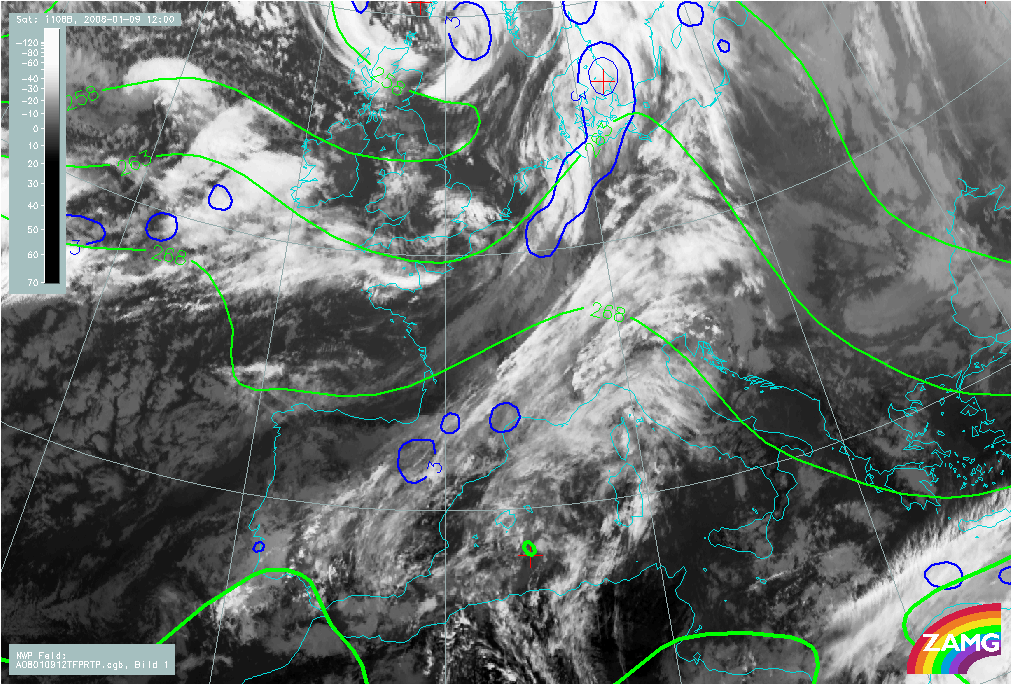 09 January 2008/12.00 UTC - Meteosat 9 IR10.8 image; blue: thermal front parameter (TFP), green: equivalent thickness 500/850 hPa