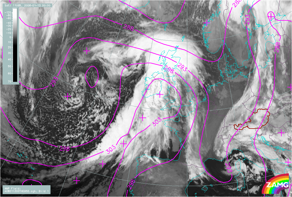 13 January 2008/00.00 UTC - Meteosat 9 IR10.8 image; magenta: equivalent potential temperature 850 hPa