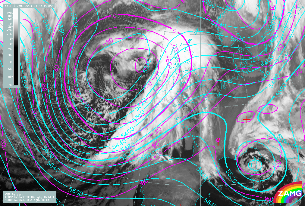 13 January 2008/00.00 UTC - Meteosat 9 IR10.8 image; magenta: height contours 1000 hPa, cyan: height contours 500 hPa