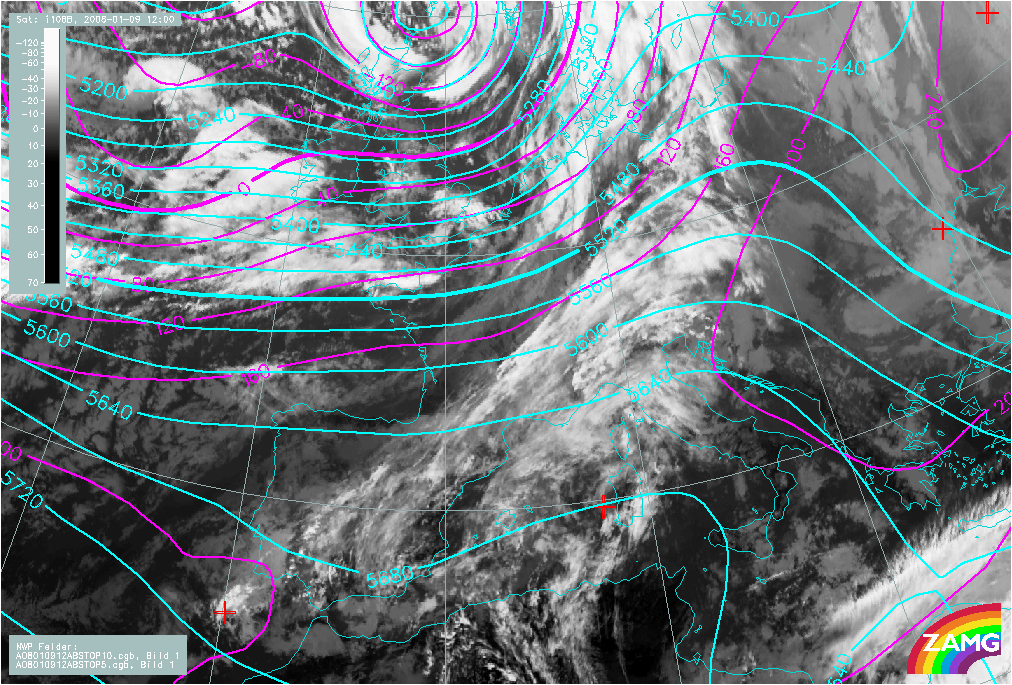 09 January 2008/12.00 UTC - Meteosat 9 IR10.8 image; magenta: height contours 1000 hPa, cyan: height contours 500 hPa