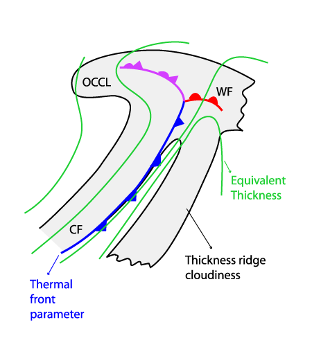 There is usually a stable stratification associated with Thickness Ridge Cloudiness, but during the summer season the area within the thickness ridge is often unstable.