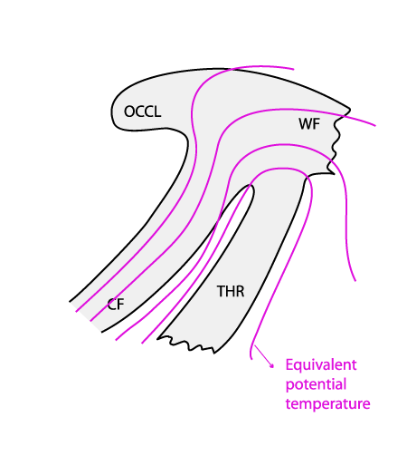 Within the ridge of the equivalent thickness (not accompanied by a TFP), the TFP zones are connected to the consecutive CF and the WF if existing. - Equivalent potential temperature at 850 hPa:
