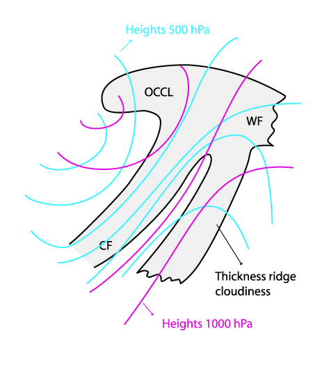 The thickness ridge cloud lies within a ridge or a maximum of the equivalent potential temperature at 850 hPa - Height Contours at 1000 hPa and 500 hPa: