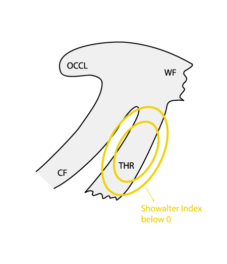 Whereas in the first case the values of Showalter index are nicely related to the cloudiness within the Thickness Ridge, in the last two examples (winter cases) the values of Showalter index are lower than 3, but for the whole frontal region and not specifically for the THR clouds.
